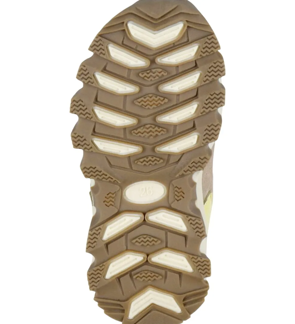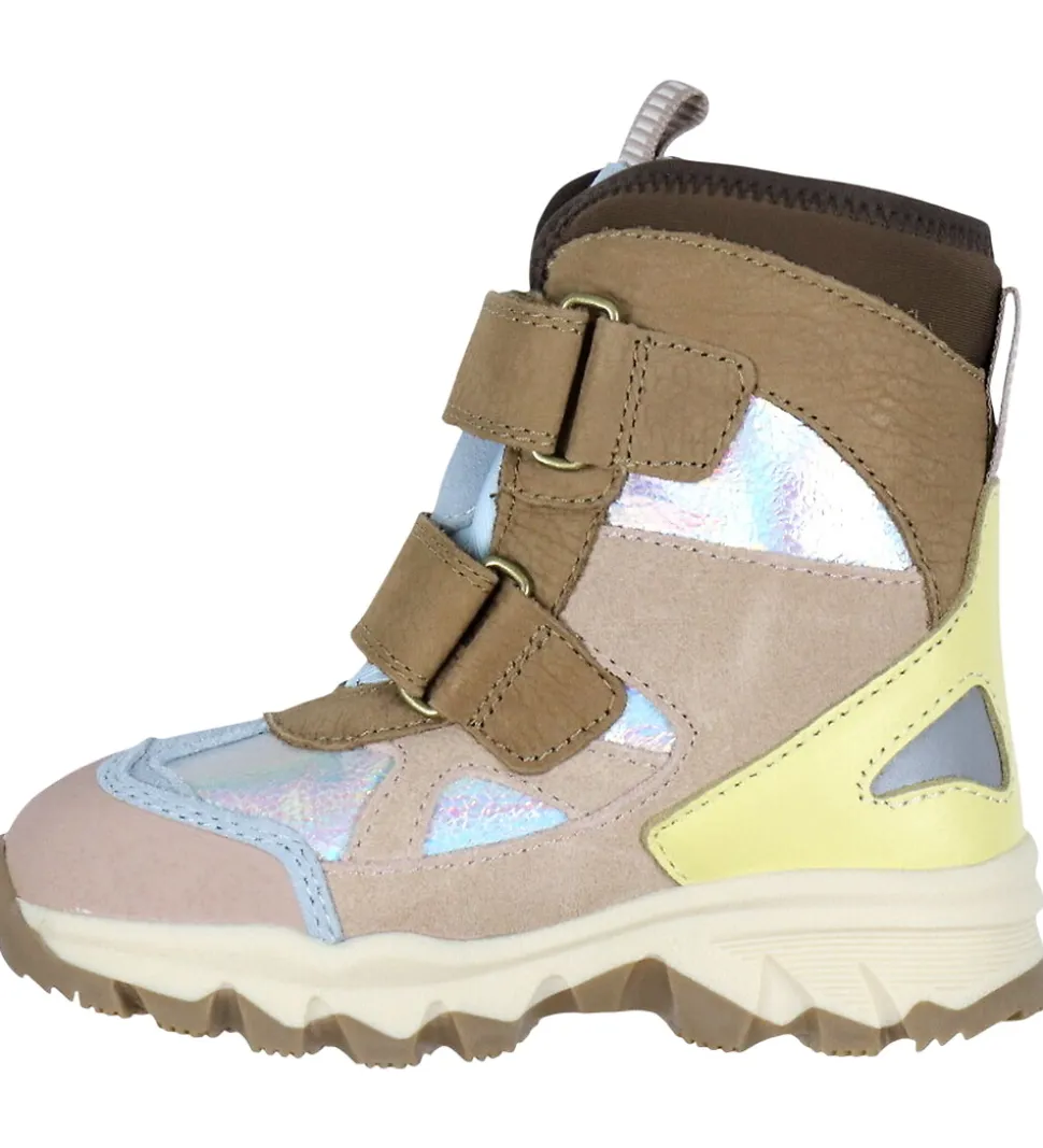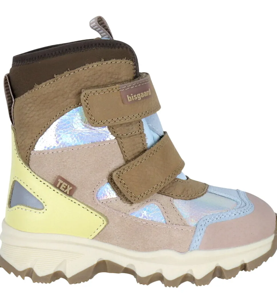 Skønne Bisgaard støvler i brunt, rosa og gult skind og ruskind med detaljer i metallisk sølv. Støvlerne har refleksdetaljer bagpå.