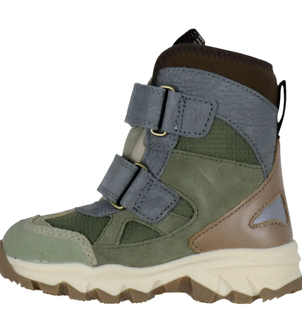 Smarte Bisgaard støvler i brunt, blåt og grønt skind, ruskind og tekstil. Støvlerne har refleksdetaljer bagpå.