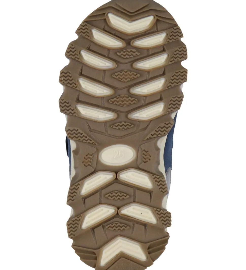 Skønne Bisgaard støvler i navyblåt skind, ruskind og tekstil med detaljer i grå og brun. Støvlerne har refleksdetaljer bagpå.