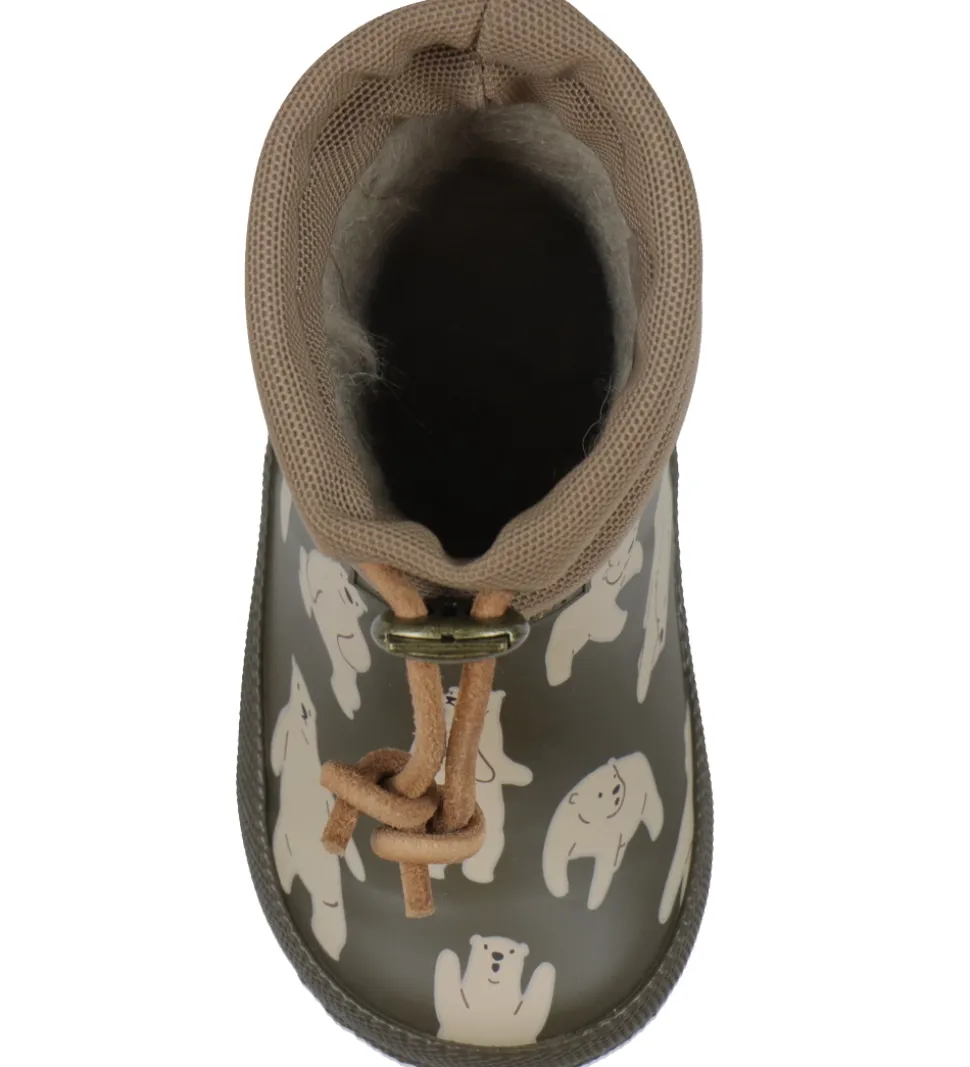 Søde Bisgaard termostøvler i armygrøn med alloverprint af beige bjørne. Toppen er i brun, og under bunden er termostøvlerne lyseblå.