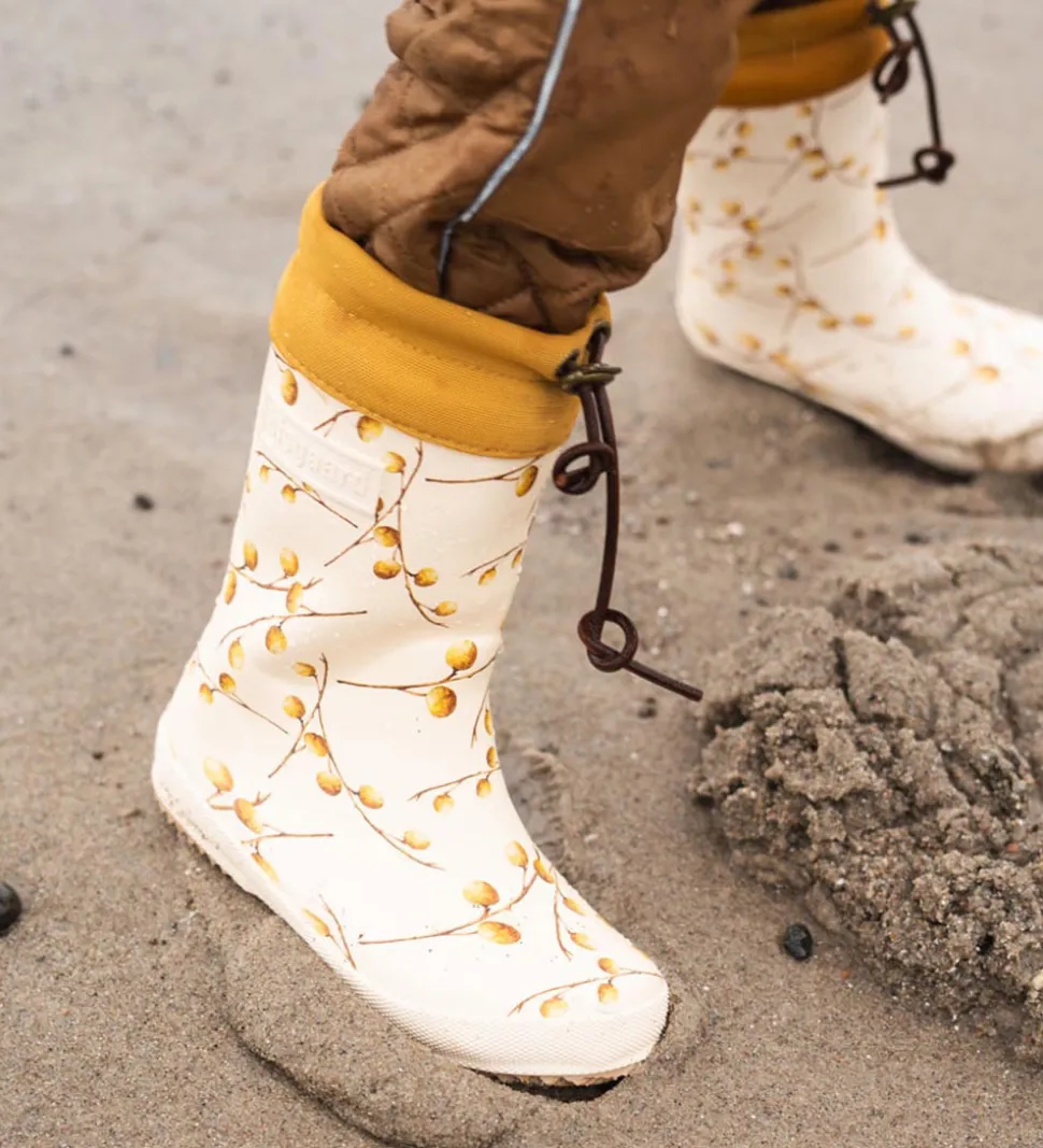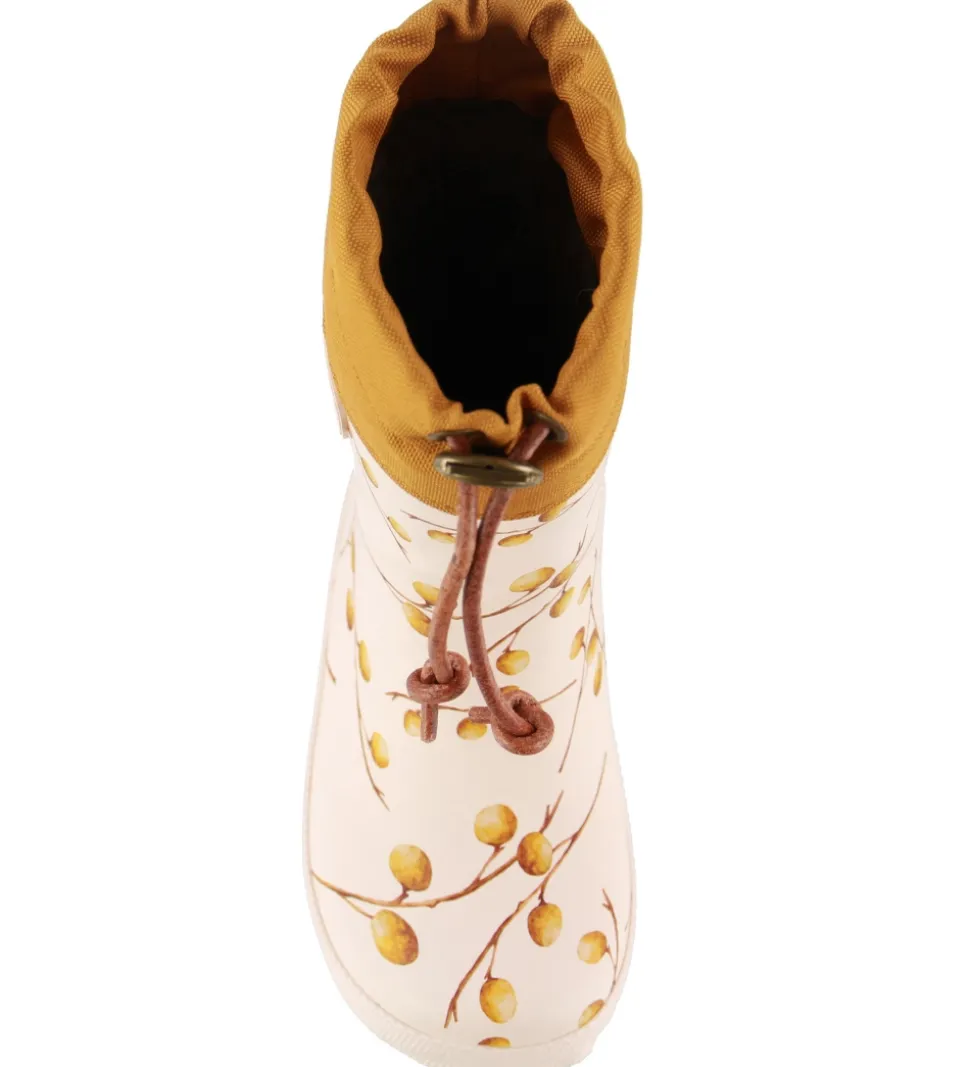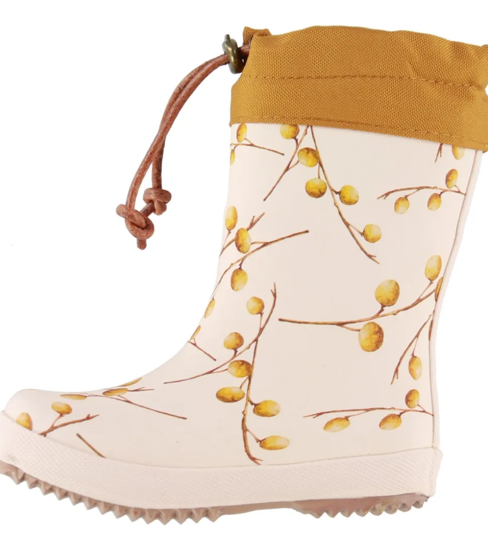 Fine Bisgaard termostøvler i lys pudder med et flot allover print af stilke med longan frugter. På ydersiden af skaftet er der et mærke med navnet “Bisgaard” i pudder.