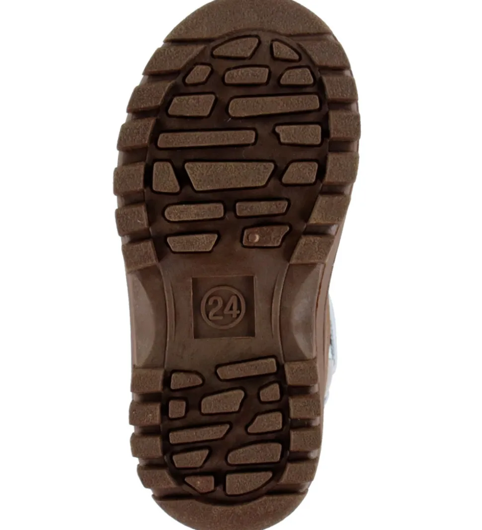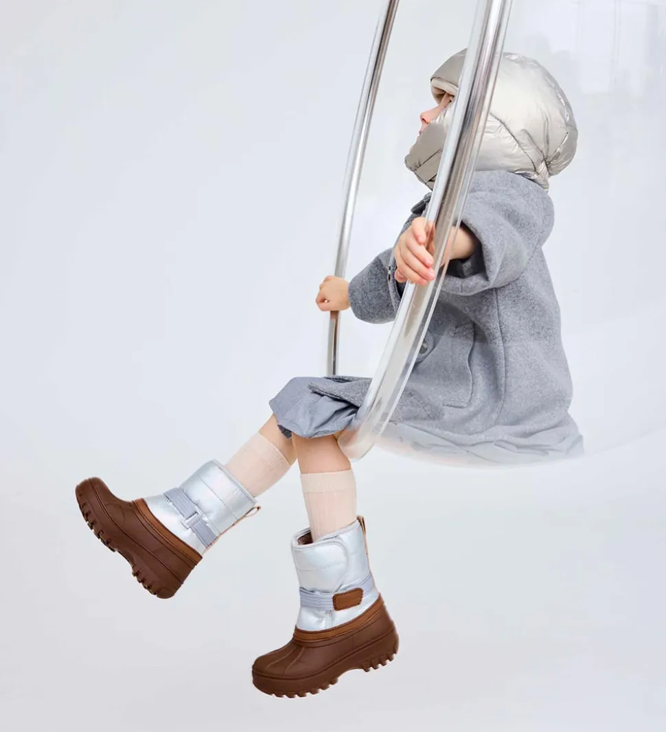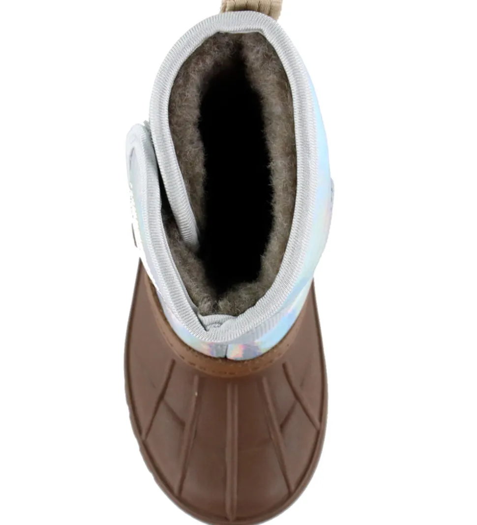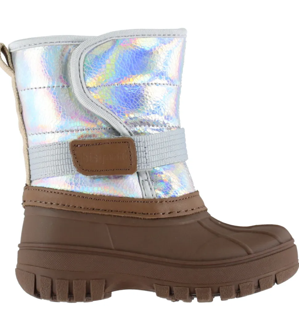 Seje vinterstøvler fra Bisgaard med brunt gummi nederst og metallisk sølv skind øverst med holografisk effekt. Vinterstøvlerne har detaljer i brunt læder.