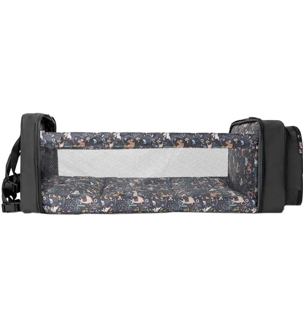 Smart Bizzi Growin kombineret pusletaske og rejseseng i sort, vegansk læder. Indvendigt har den et sort for med et farverigt dyreprint.