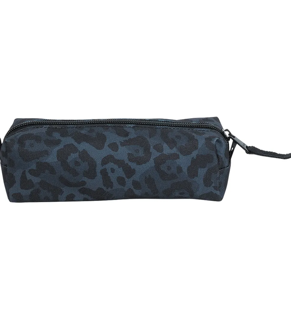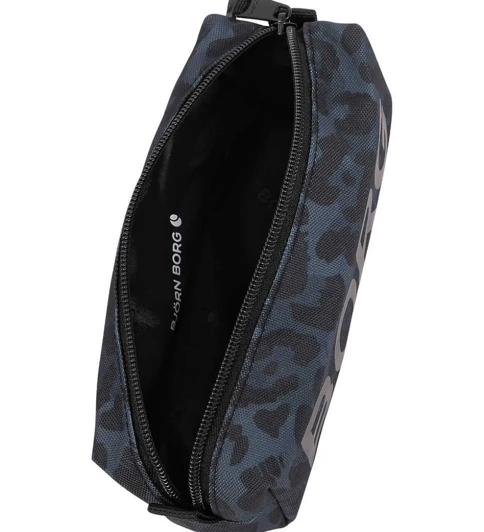 Fint Björn Borg penalhus med leopardprint i sorte og mørkeblå nuancer, og med et stort, sort logo på fronten. Penalhuset fra Björn Borg har en rund facon og består af ét stort rum, som åbnes med lynlås, så der er nem adgang til skriveredskaberne.