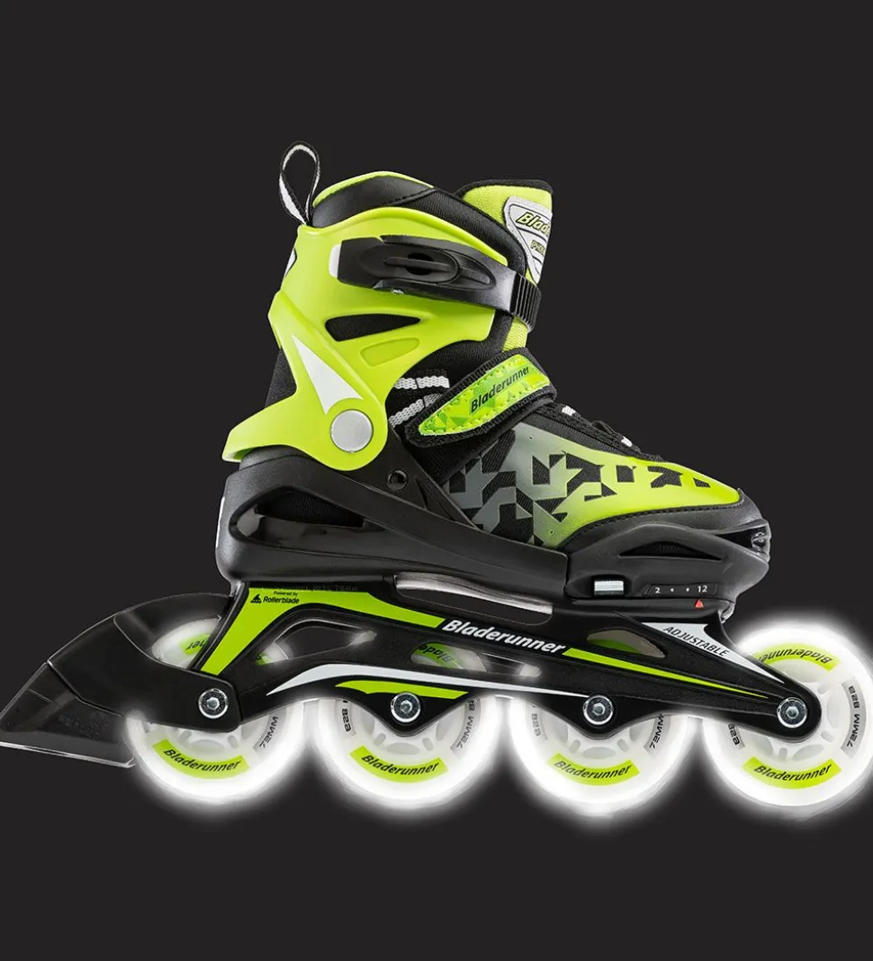 Søde Bladerunner rulleskøjter i sort og grøn med LED lys i hjulene, så du kan holde øje med dit barn, selv hvis de ruller i mørke.