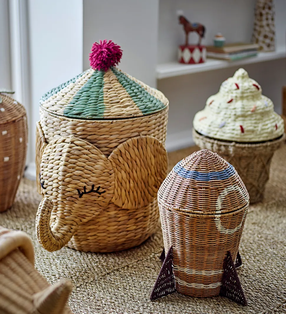Praktisk Bloomingville kurv i en varm brun farve med hvide og blå detaljer, så den ligner en rumraket. I toppen har den et låg,som kan tages helt af. Bloomingville kurven er både dekorativ og funktionel på børneværelset eller i det legesyge hjem.