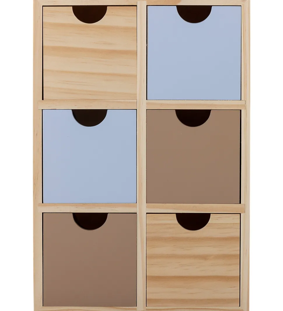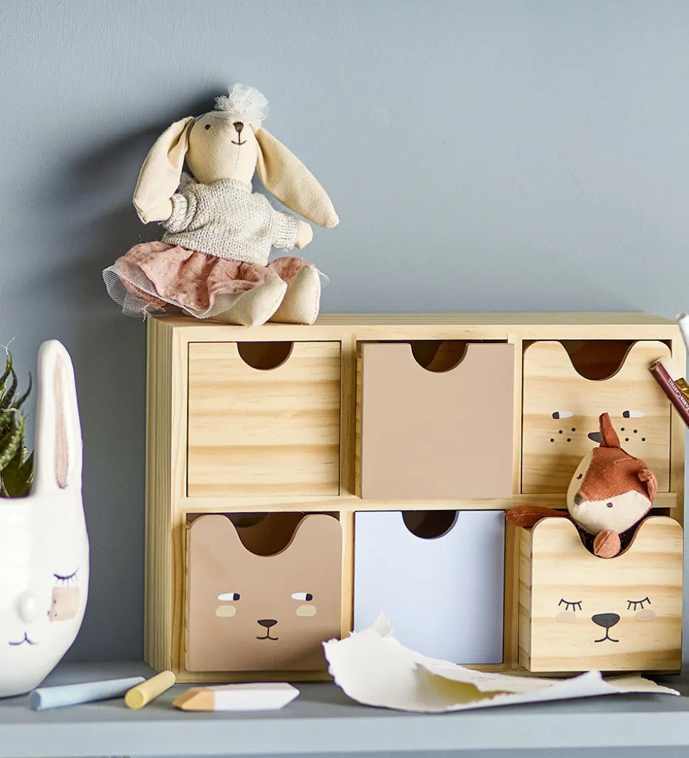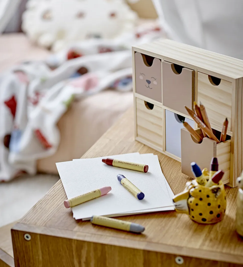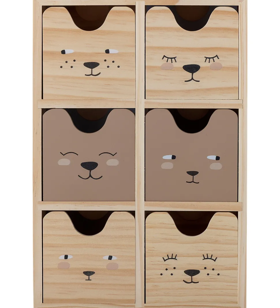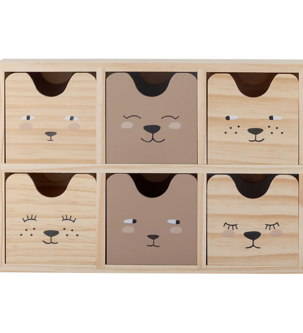 Charmerende Bloomingville opbevaringskasse i træ med seks små skuffer med vendbare sider. På den ene side er der søde dyreansigter, mens der på den anden side er enkle farver i træ, brun og blå. Opbevaringsæsken er fin at have stående på børneværelset, og kan bruges til opbevaring af diverse småting.