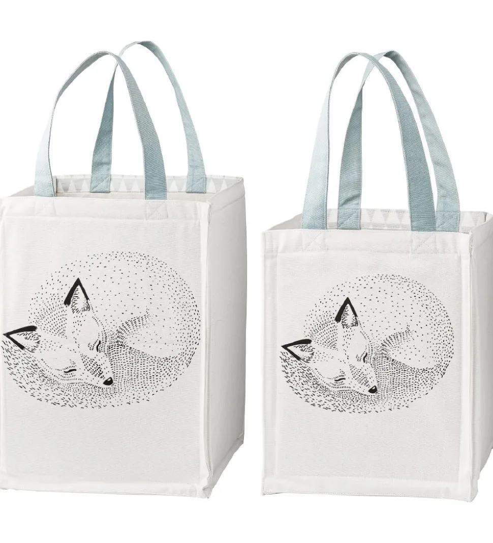 Flotte Bloomingville opbevaringsposer i hvid. På forsiden er der et sort print af en sovende ræv, og på bagsiden er der et trekantet mønster i hvid og lyseblå.