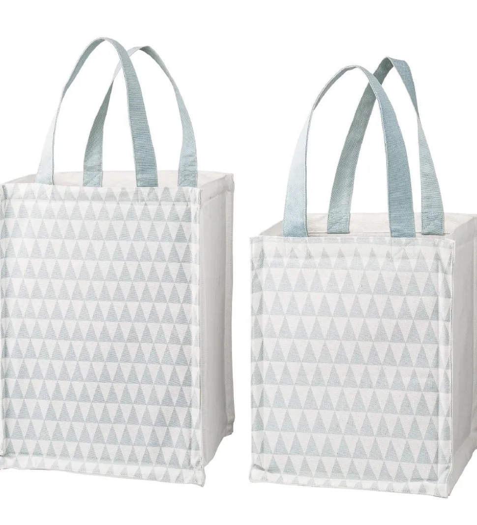 Bloomingville opbevaringskasserne har fire sider, der står oprejst med pap imellem bomuldsstoffet. I toppen har de to praktiske hanke i lyseblå, så de let kan bæres andre steder hen. Poserne er fx perfekt til opbevaring af alt yndlingslegetøjet samtidig med, at de er super dekorative på børneværelset.