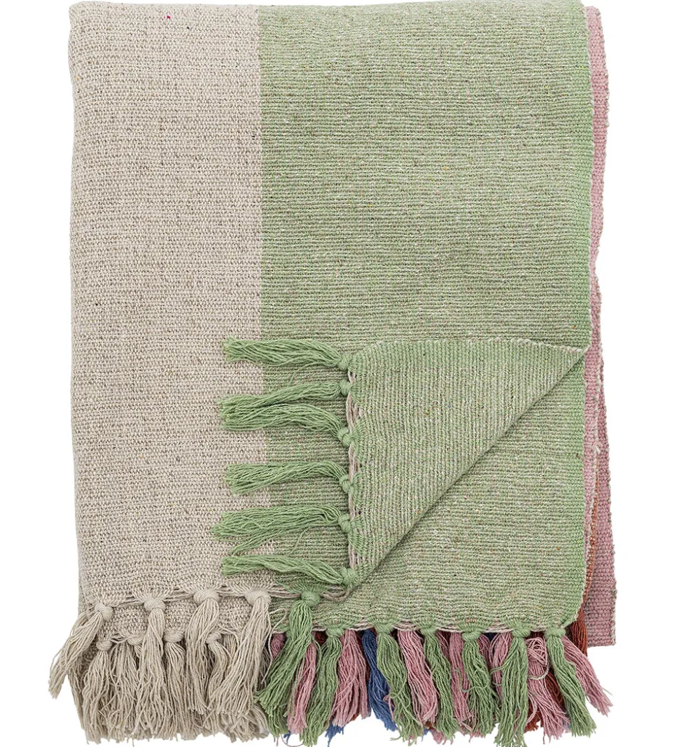 Flot Bloomingville tæppe, strikket i en let grøn nuance med farverige frynser og et unikt design.