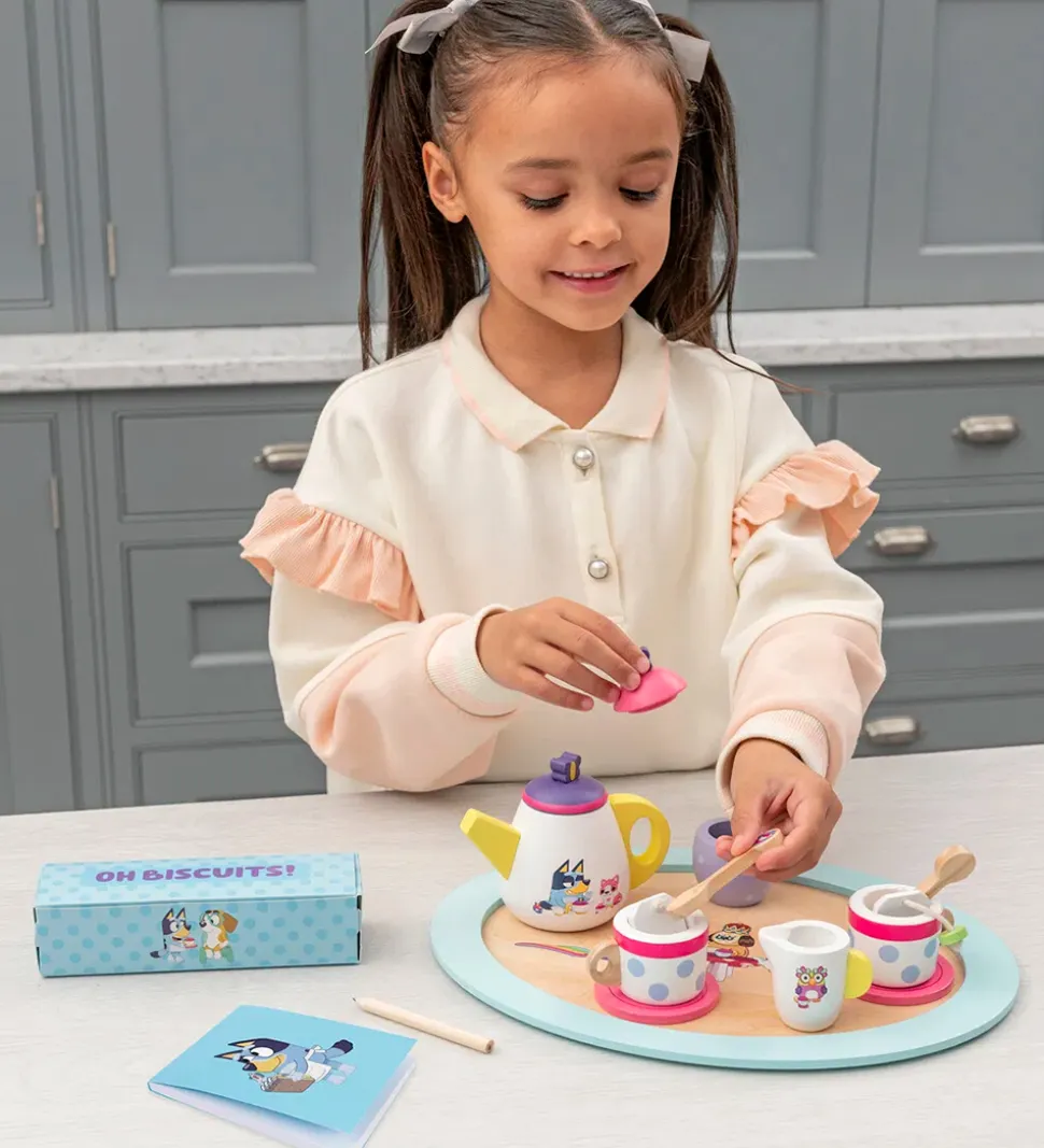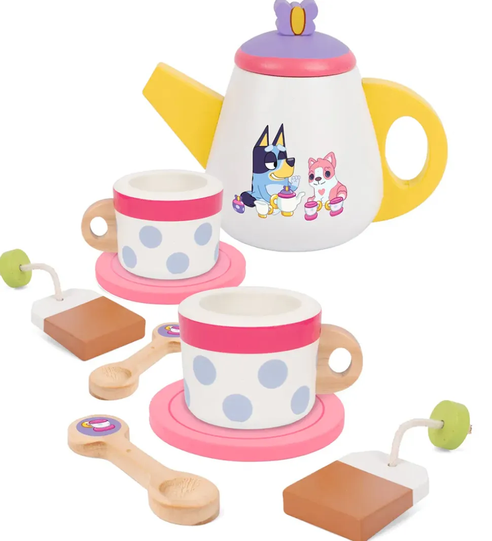 Underholdende Bluey tesæt i træ med fine Bluey-print. Sættet indeholder: