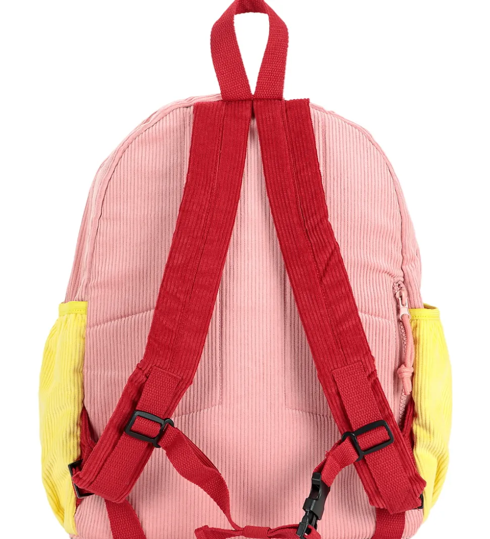 Farverig Bobo Choses skoletaske i en kombination af lyserød, grøn, blå og gul med fløjlstruktur.