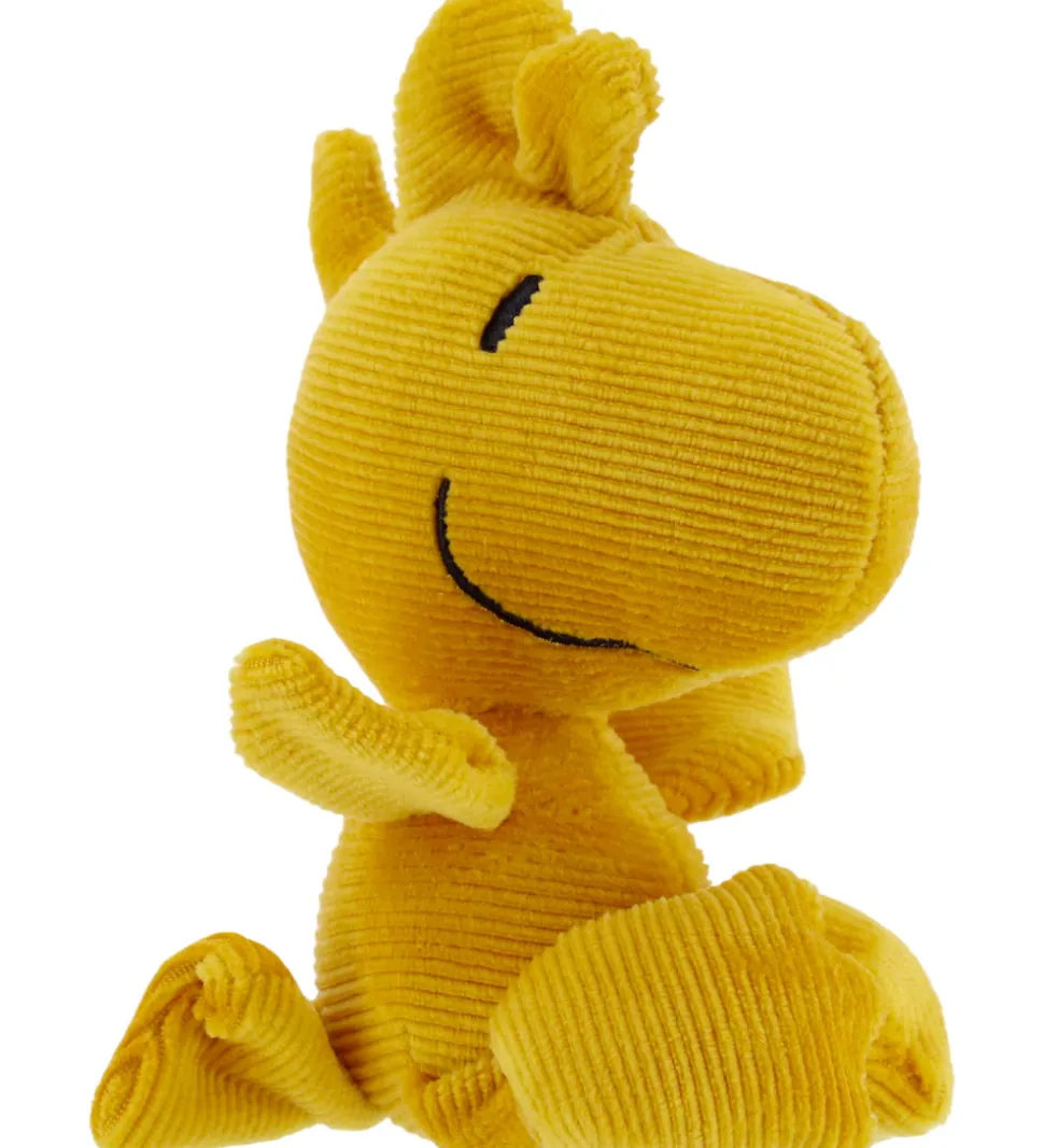 Sød Bon Ton Toys bamse, som forestiller Woodstock fra tegneserien Peanuts lavet af gult fløjl.