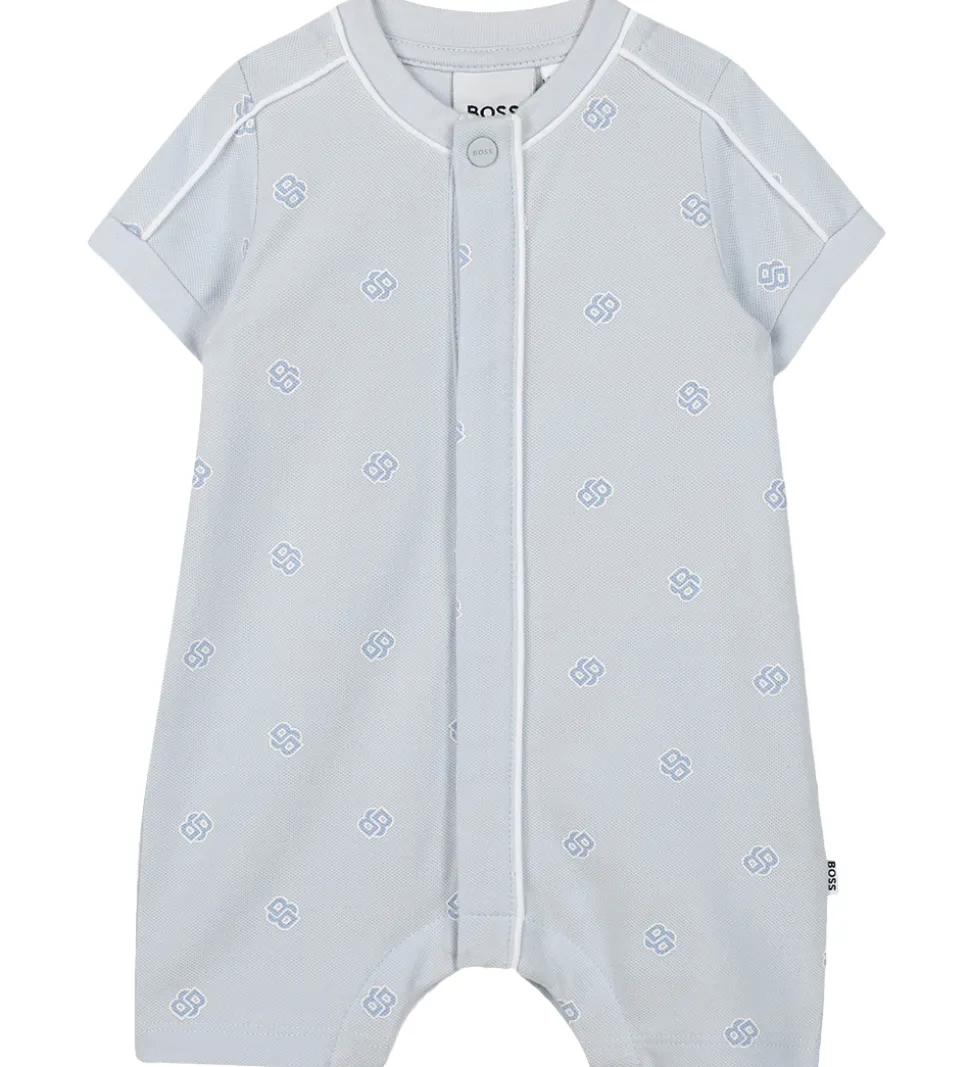 Fin BOSS sommerdragt i lyseblåt piqué med et alloverprint i blå og hvid med to B’er, der er flettet sammen.