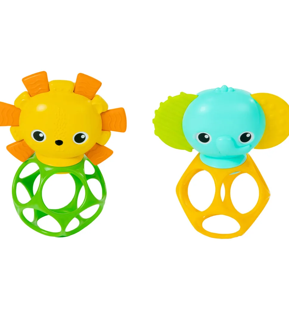 Sjov Bright Starts aktivitetslegetøj solgt i en 2-pak som forestiller en bidering med et elefant hoved på den ene og et løve hoved på den anden.