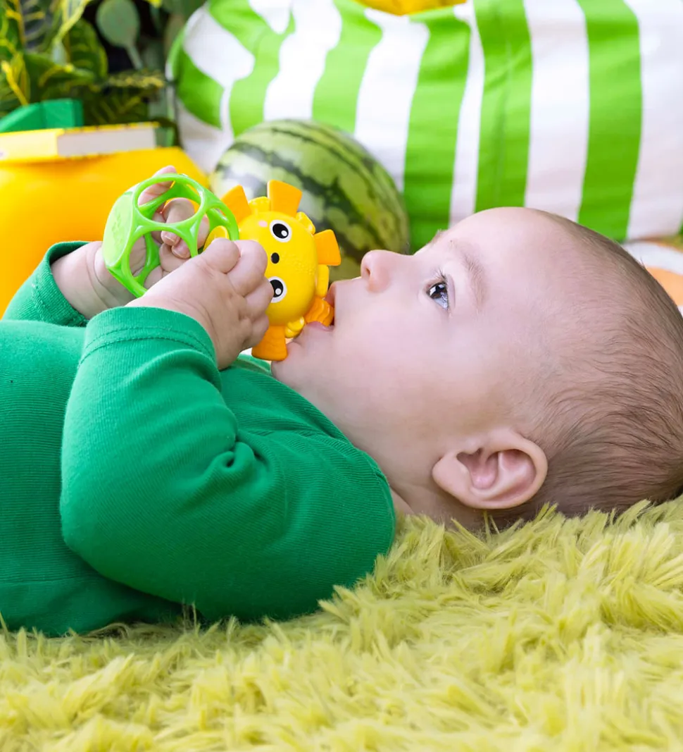 Bright Starts legetøjet er en smart bidering som er lavet af fleksibel og holdbart Oball-teknologi som er nemt for baby at holde om. Legetøjet har masser af storer huller som gør det nemt for baby at gribe fat i, og som fremmer finmotorikken. Bagpå løvens hoved er et lille spejl som fremmer selvopdagelse og indeni elefantens hoved er sjove rasleperler.