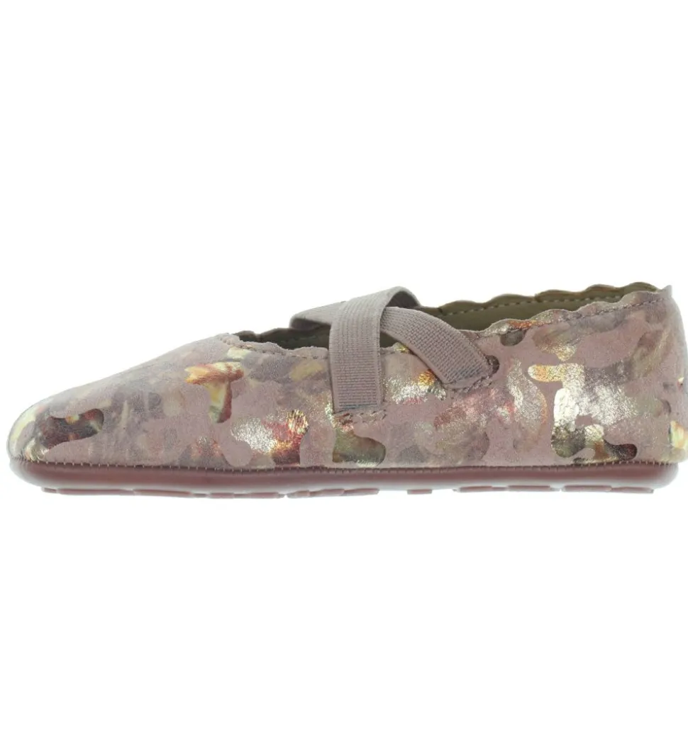 Skønne Bundgaard ballerina hjemmesko i rosa ruskind med et camouflageprint i guld og bronze.