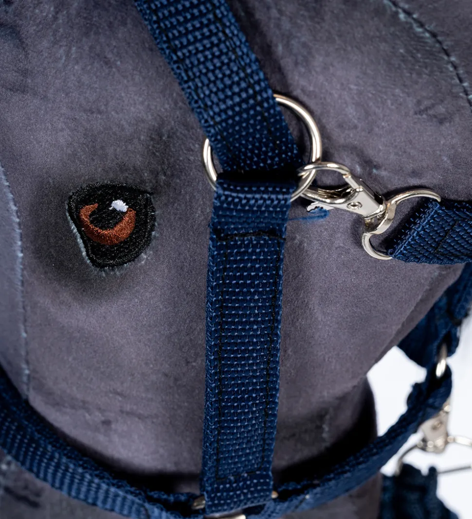 by Astrup grimen kan justeres med et spænde ved nakken og lukkes under kæphestens hage med en stållukning. Træktorvet er aftageligt fra grimen.