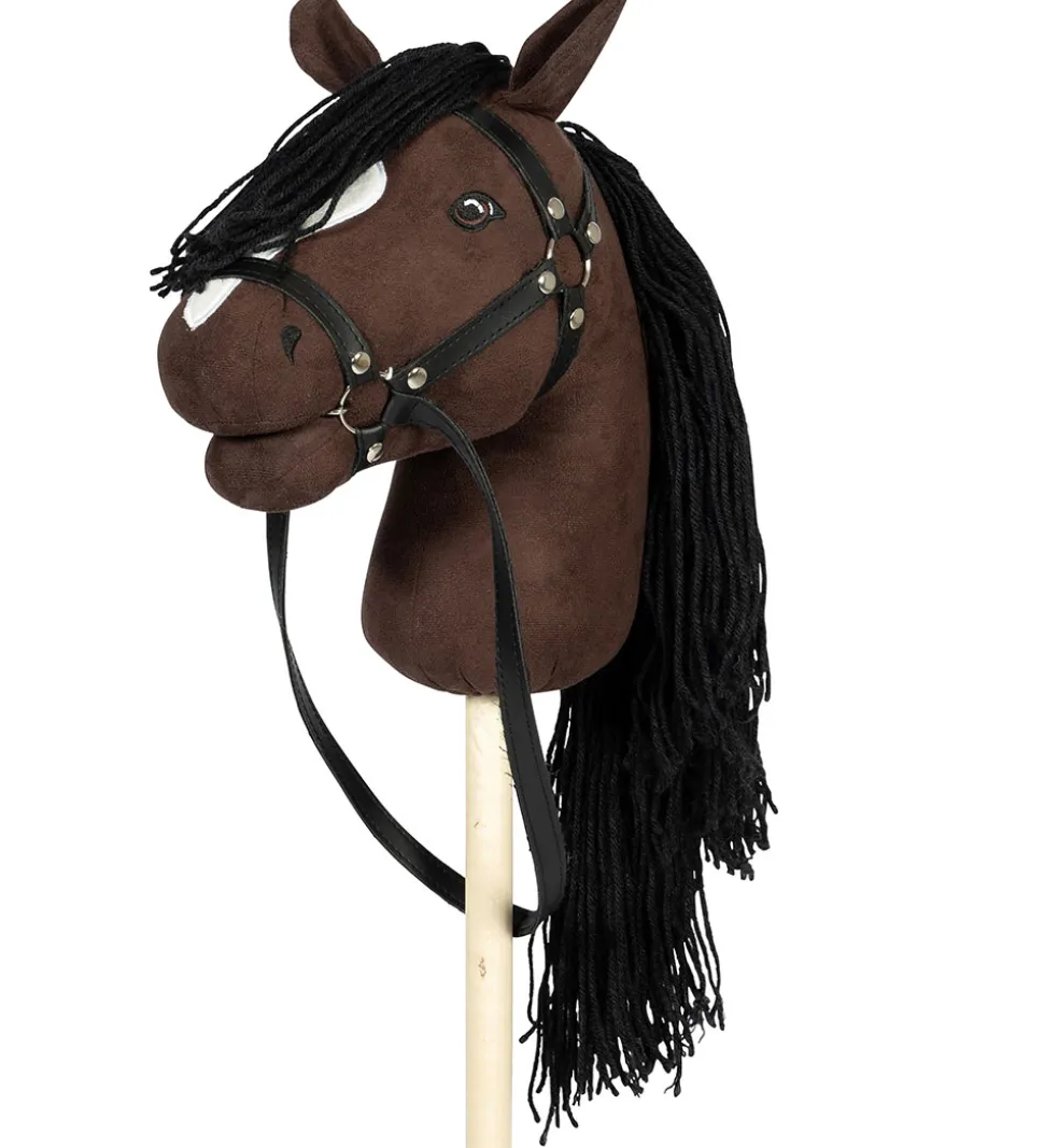 Flot by ASTRUP kæphest med et mørkebrunt hestehoved med lang, sort manke og sort hovedtøj.