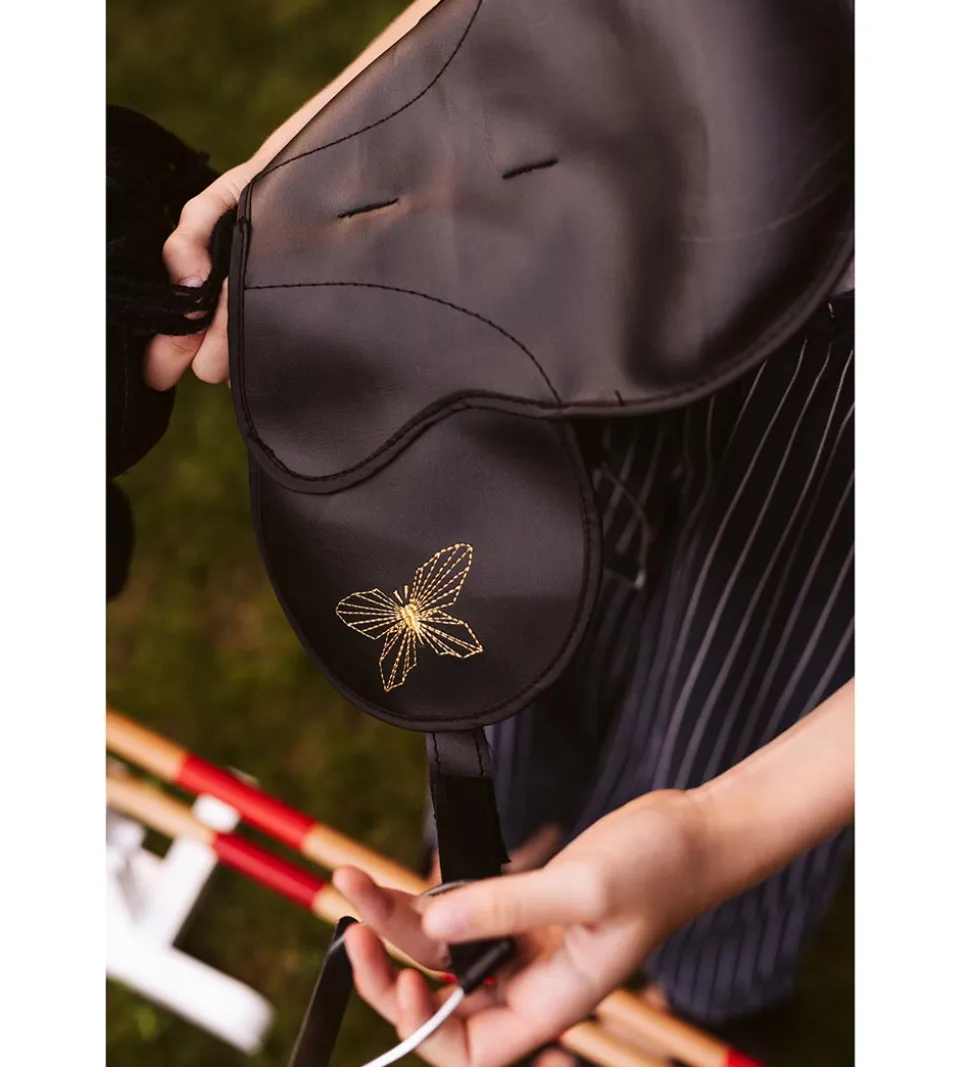 Smart by ASTRUP sadel til brandets flotte kæpheste. Sadlen er sort, imiteret læder med guldlogo og metalbøjler.