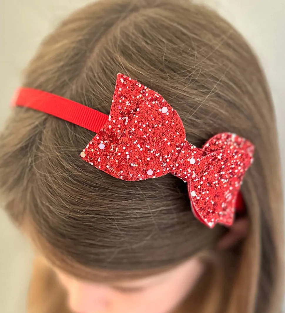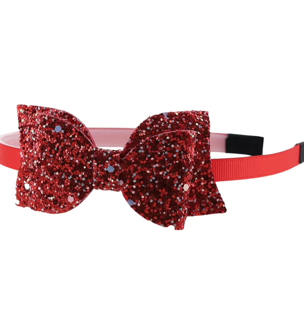 Elegant By Stær hårbøjle i rød og med en stor glimmersløjfe på fronten.