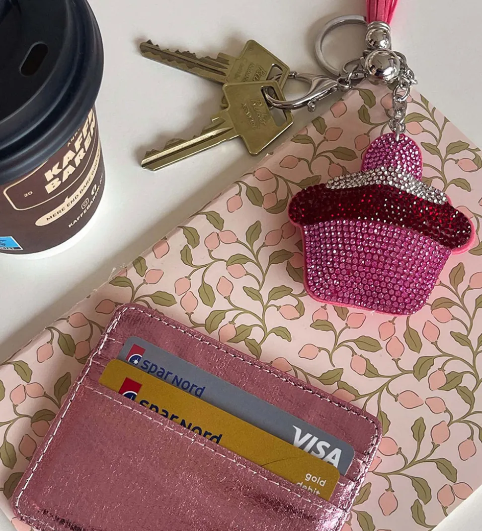 Sjov By Stær nøglering formet som en muffin i rød med små rhinsten i pink, rød og sølv. Nøgleringen er i sølv metal med et rundt vedhæng og et vedhæng med pinke frynser. Nøgleringen sættes nemt fast på en taske og sammen med sine nøgler.