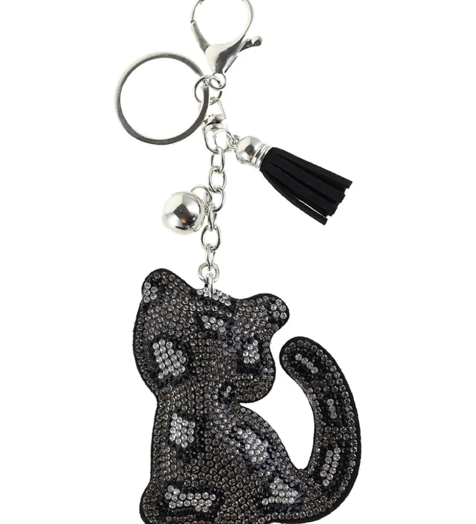 Sød By Stær nøglering formet som en kat i sort med små rhinsten i sort og sølv. Nøgleringen er i sølv metal med et rundt vedhæng og et vedhæng med sorte frynser. Nøgleringen sættes nemt fast på en taske og sammen med sine nøgler.