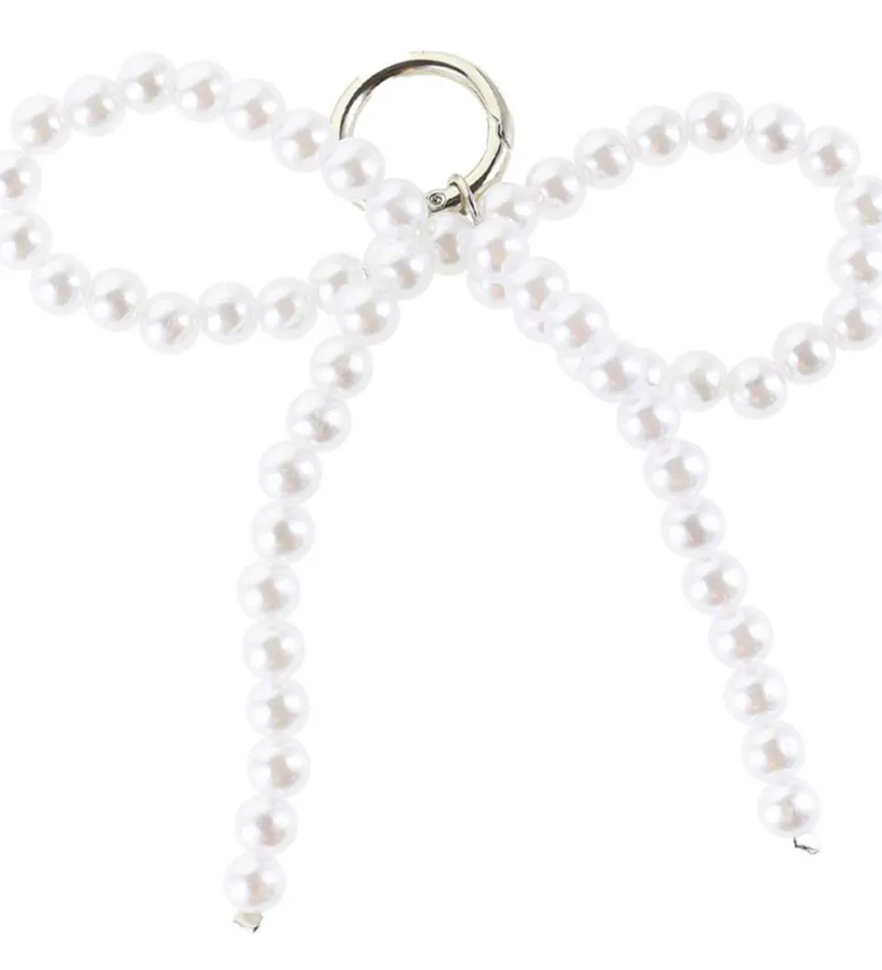 Sød By Stær nøglering formet som en sløjfe i hvide perler. Nøgleringen er i sølv metal og sættes nemt fast på en taske og sammen med sine nøgler.