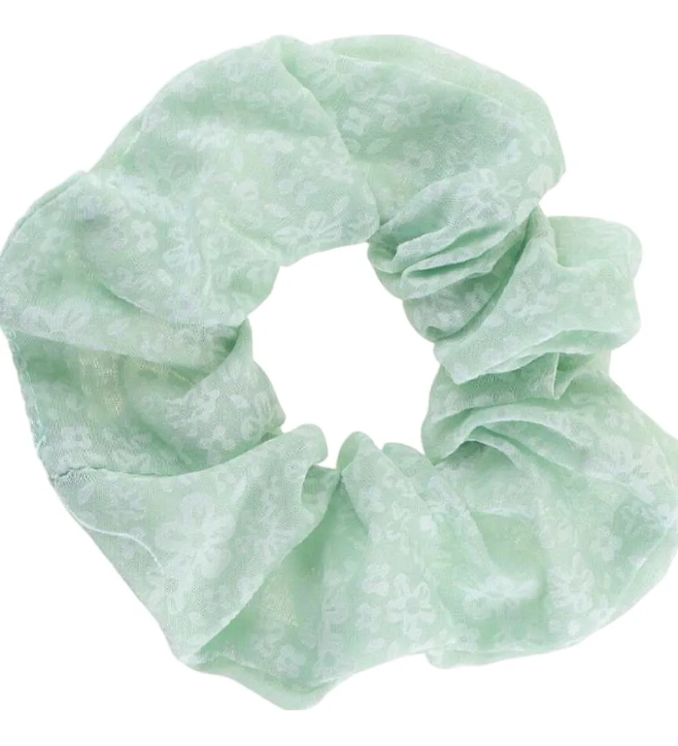 Flot By Stær scrunchie i en fin mintgrøn farve med et diskret blomsterprint. By Stær scrunchien tilfører et fint udtryk til frisuren.