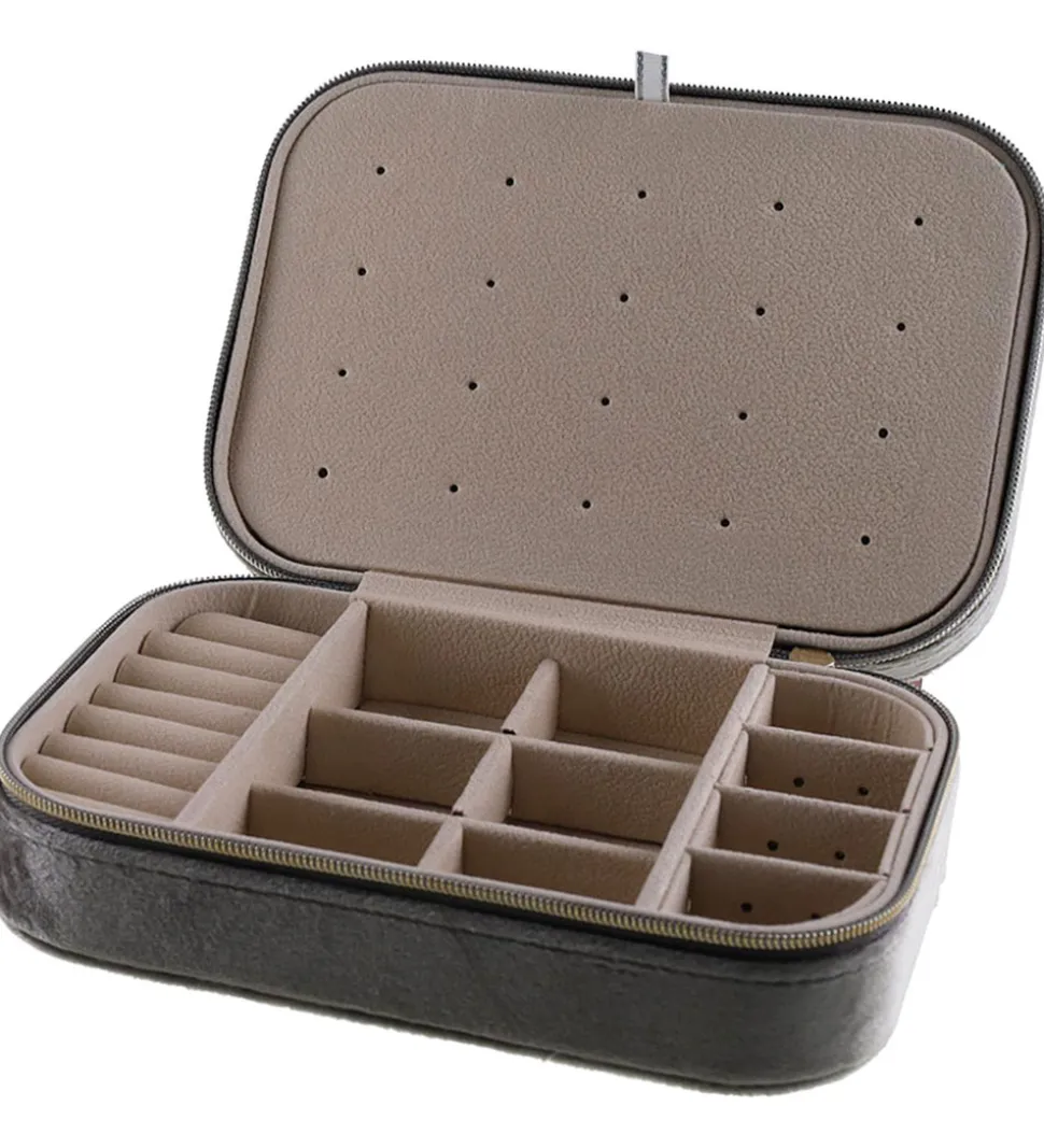 By Stær smykkeæsken åbnes med en lynlås, og indeni er den nederste del opdelt i små rum så det er nemt at organisere smykkerne. I låget er der praktiske hanke til at hænge halskæden på så den ikke filtres sammen, og så er der en lang stiklommer til at opbevare diverse småting. De to sider af æsken er delt med en praktisk flap, der har små huller til øreringe.