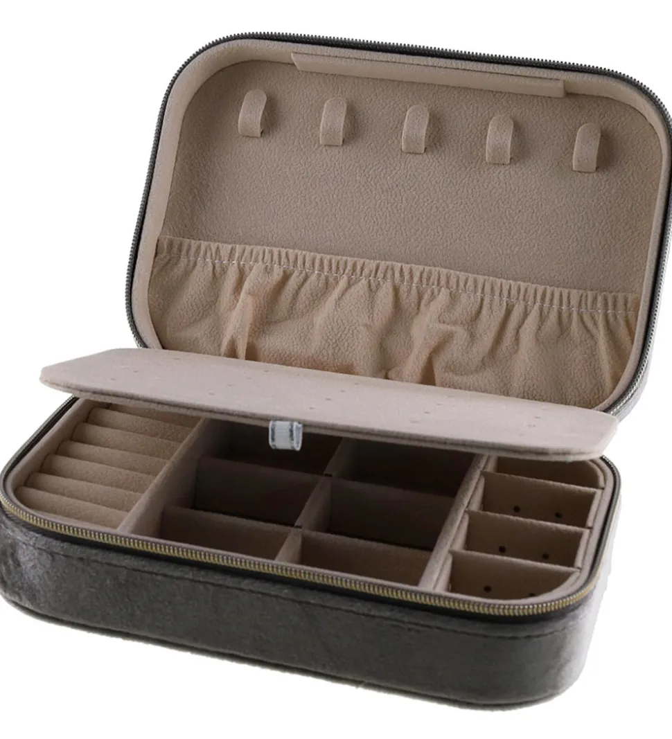 Praktisk By Stær smykkeæske i grå velour, med en rektangulær form.