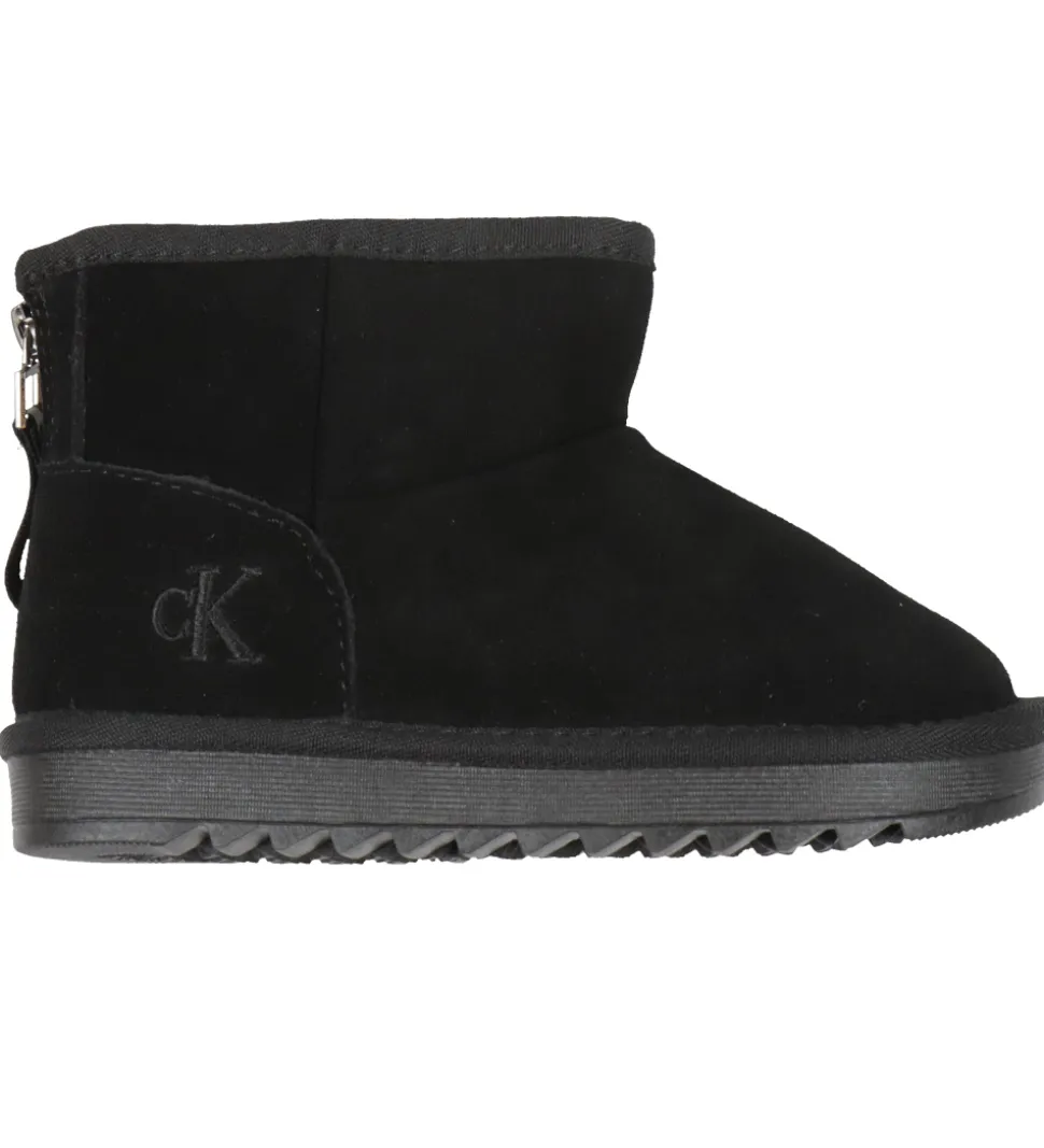 Skønne Calvin Klein bamsestøvler i sort ruskind med et sort, broderet logo på ydersiden. Bagtil er der en lynlås med en refleksdetalje.