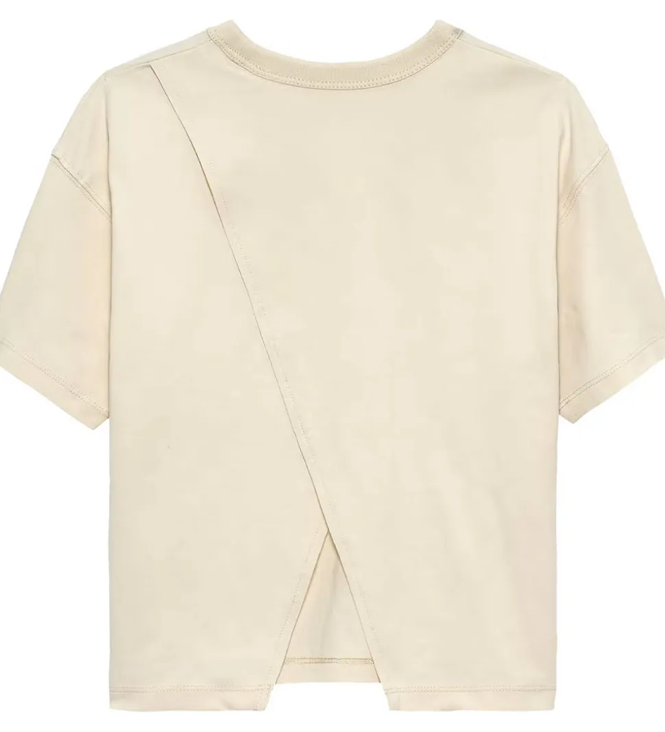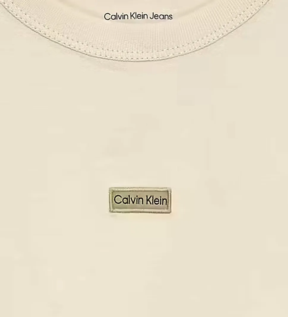 Elegant Calvin Klein t-shirt i en lys beige nuance, med en lille logo applikation fortil. T-shirten er designet med korte ærmer og en rund halsudskæring. Ryggen har et foldet design, som gør t-shirten luftig og let at bevæge sig i.