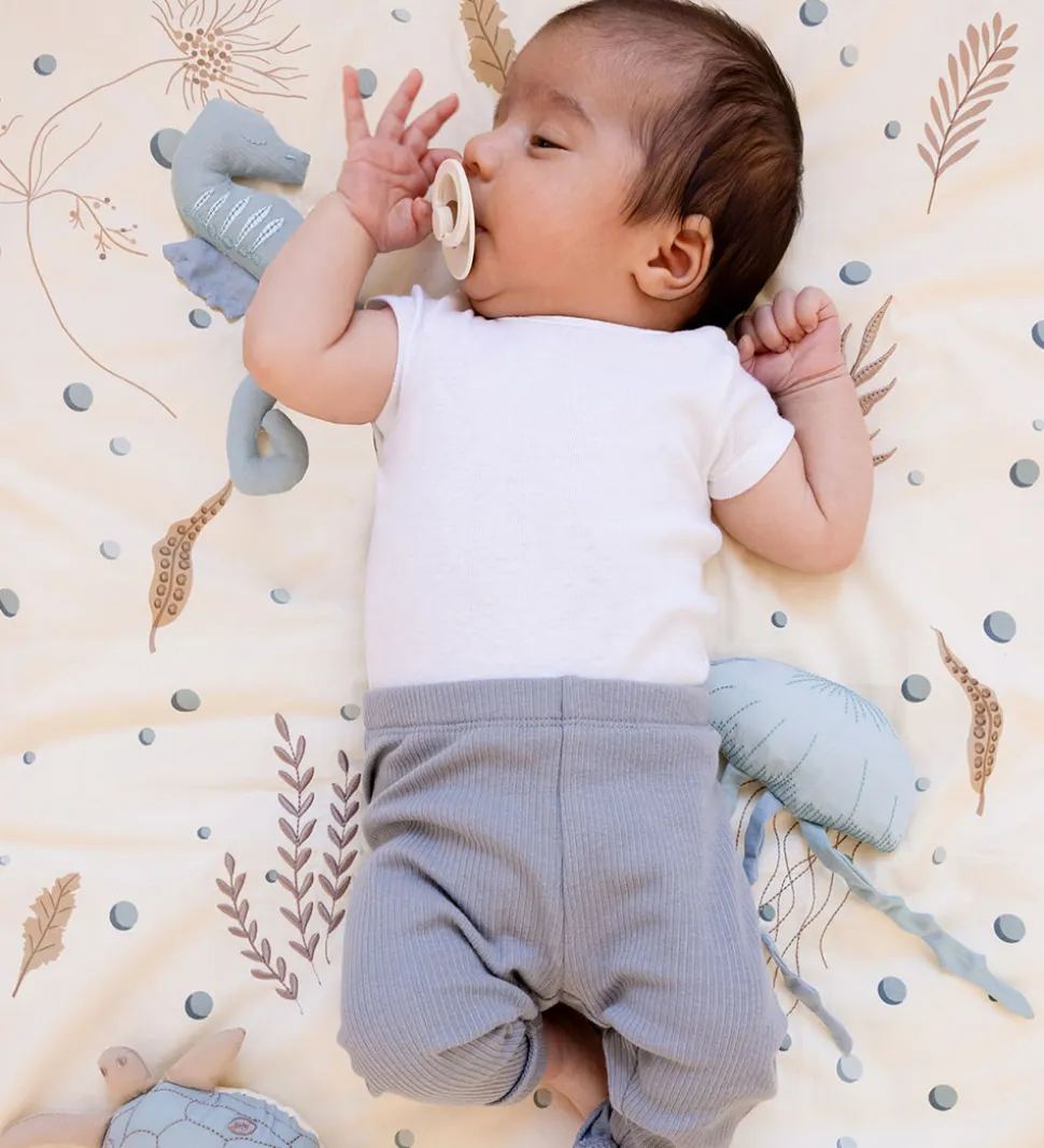 Fint Cam Cam Copenhagen aktivitetstæppe i hvid med et smukt alloverprint af havdyr og -planter i brun og støvet blå.