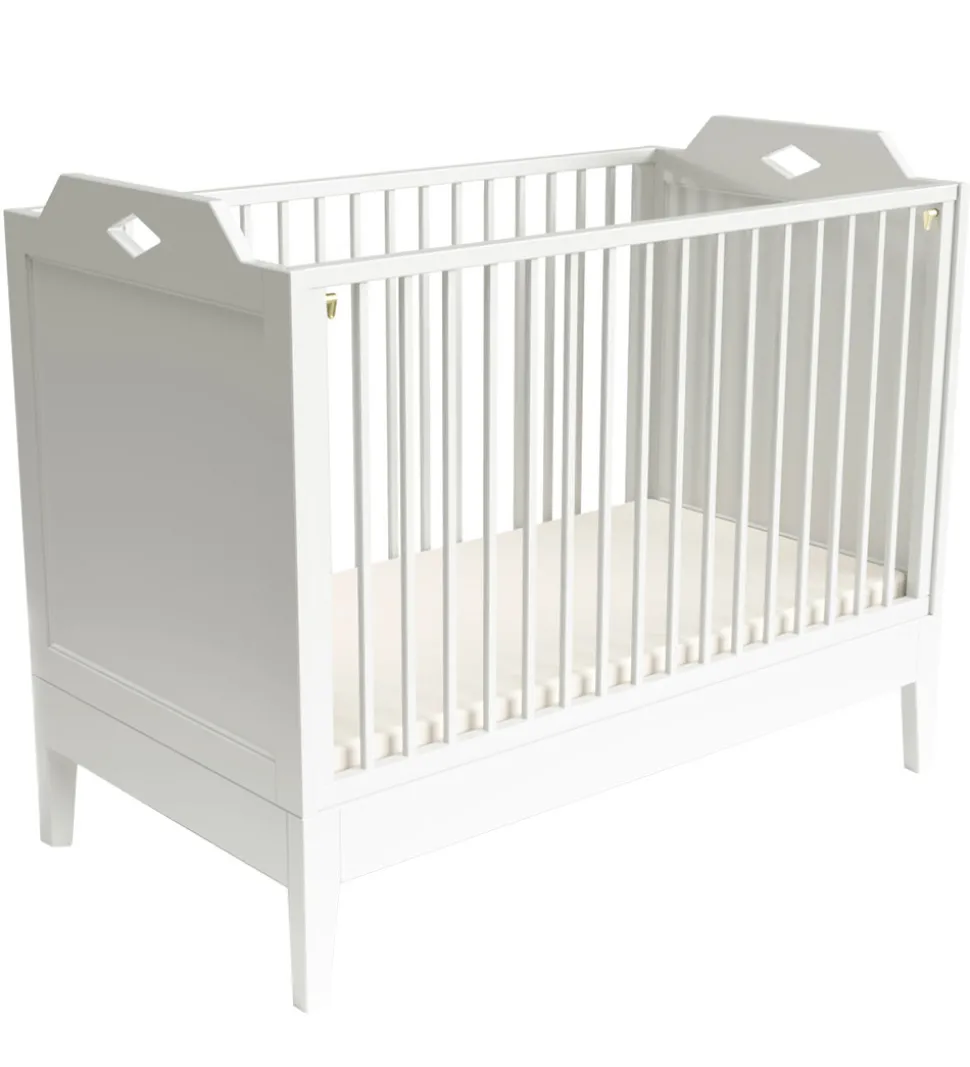 Flot Cam Cam Copenhagen babyseng i hvid. Babysengen har langsider med tremmer, og både i hoved- og fodende er der øverst en fin udskæring.