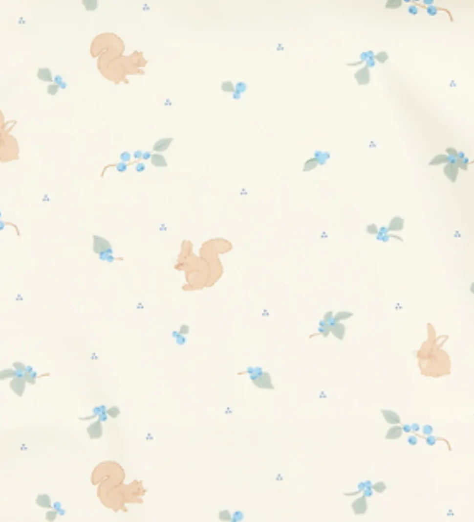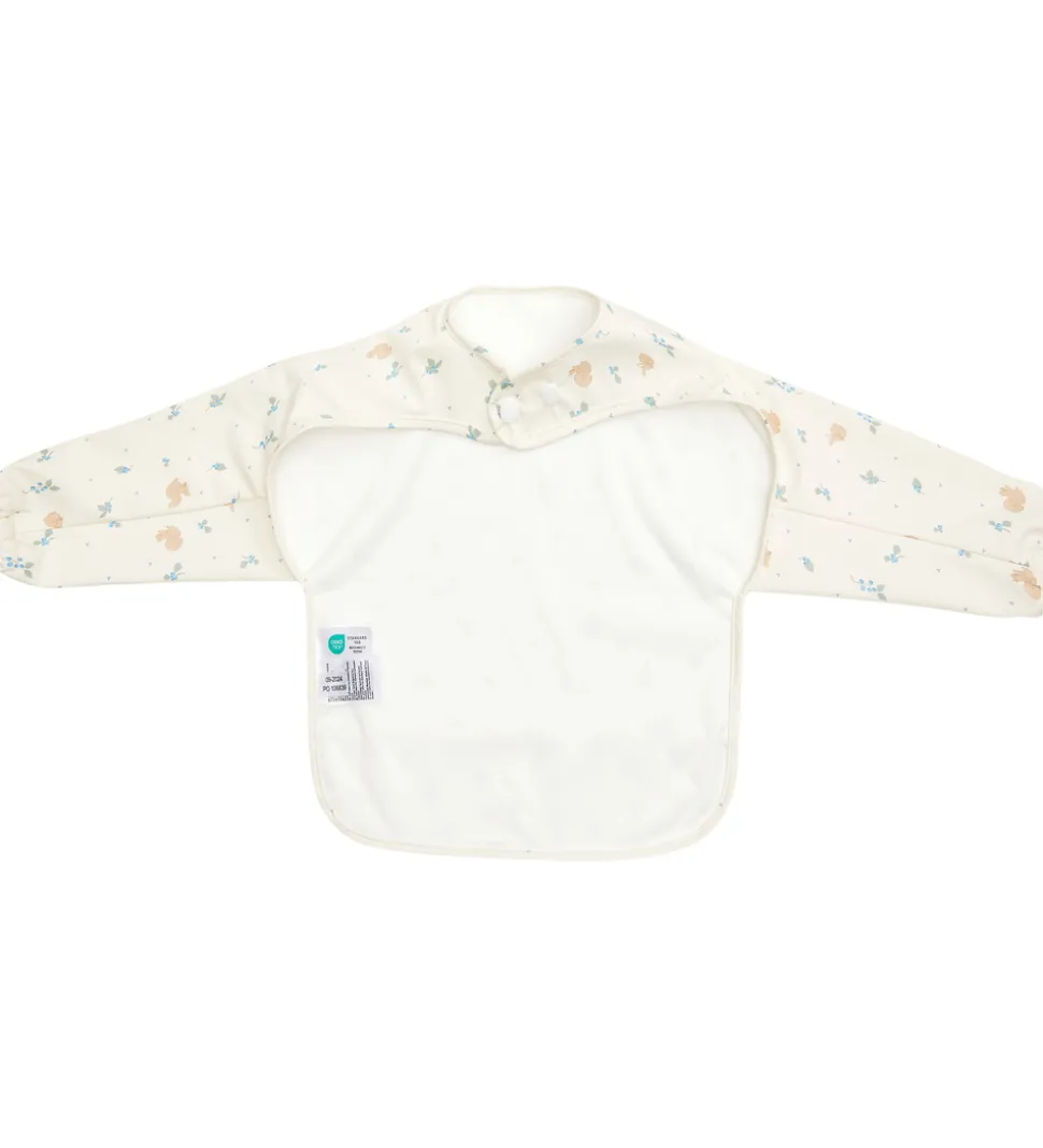Flot Cam Cam forklæde i hvid med print af egern, blåbær og blade. Forklædet har en praktisk opsamlingslomme og lange ærmer. Den lukkes i nakken med en trykknap med to forskellige indstillinger. Forklædet er let at tørre af med en fugtig klud, og tåler at blive vasket i vaskemaskinen ved 40 grader.