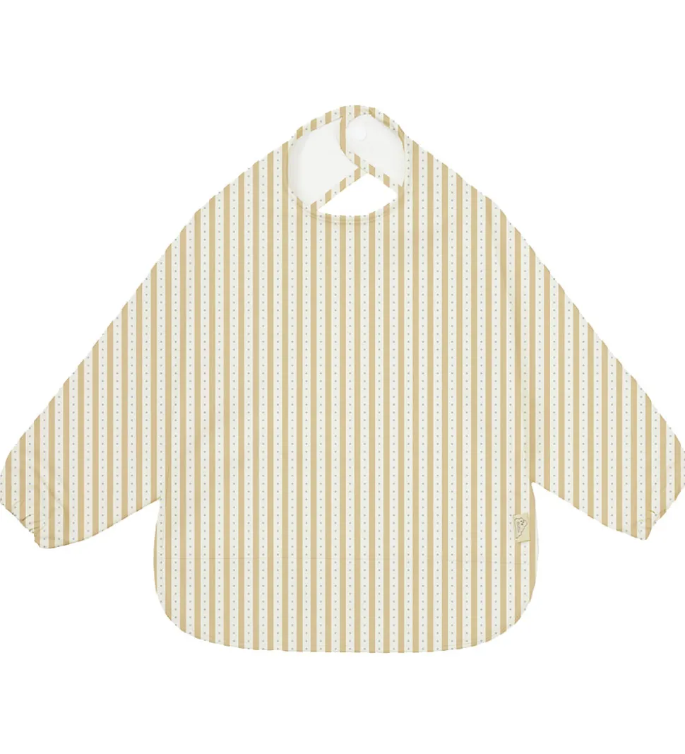 Cam Cam forklædet lukkes i nakken med en trykknap med to indstillinger. Den har lange ærmer med elastik ved håndleddene og en opsamlingslomme fortil. Forklædet er praktisk til beskyttelse under måltider og kreative aktiviteter.