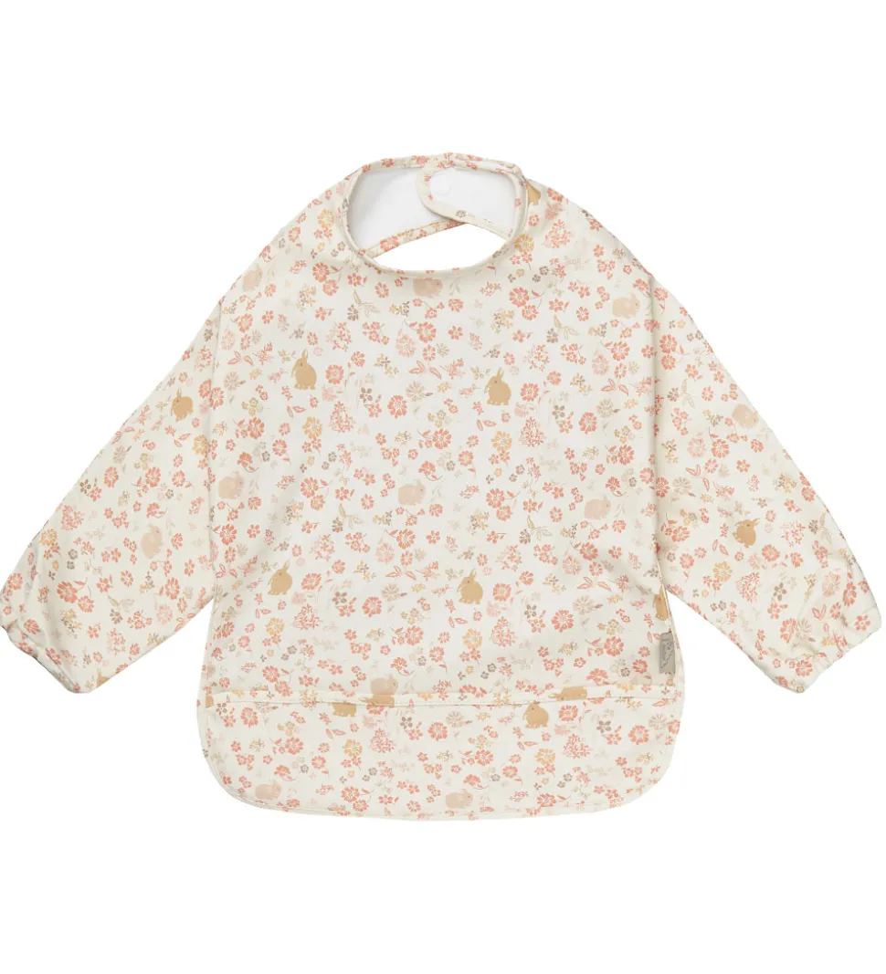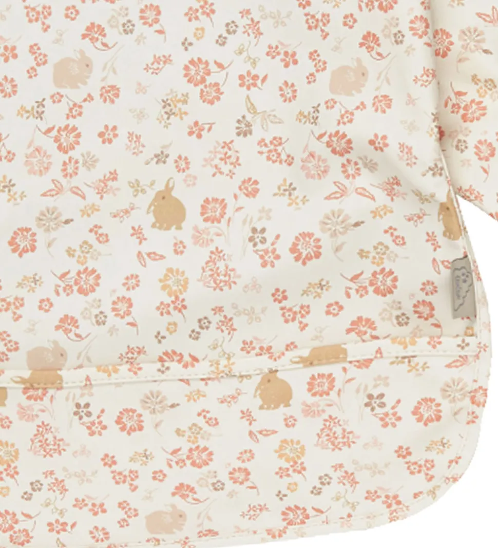 Fint Cam Cam Copenhagen forklæde i hvid med et alloverprint af blomster og kaniner i rosa og brune nuancer.