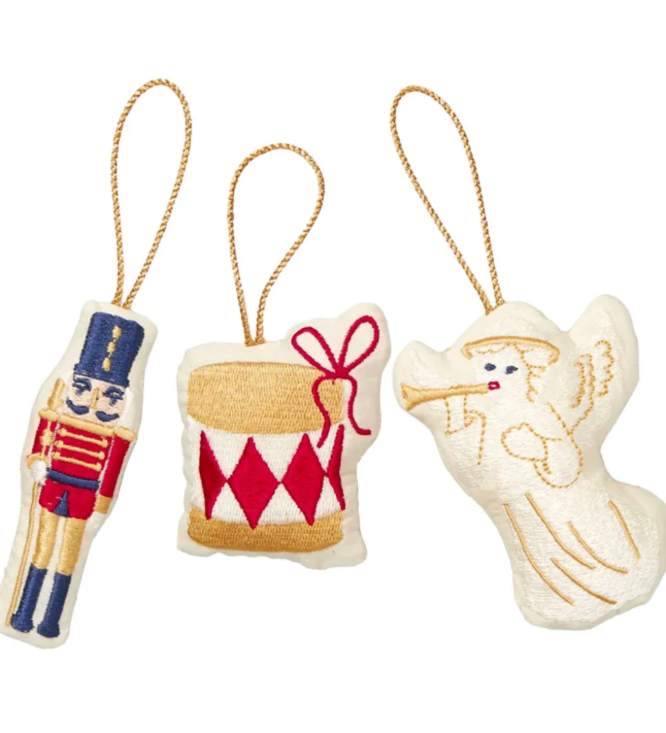 Smukt Cam Cam Copenhagen julepynt-sæt, som består af en nøddeknækker, en tromme og en engel, der alle er flot broderede.