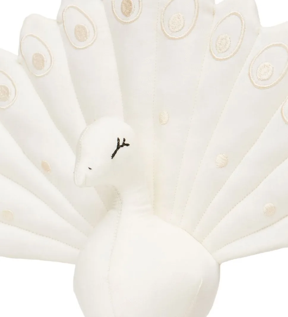 Cam Cam Copenhagen musikuroen har form som en påfugl med en træring forneden. På toppen er der en praktisk hank, så uroen er let at hænge op. Trækker man let i uroens snor, spiller den melodien “Lullaby”.