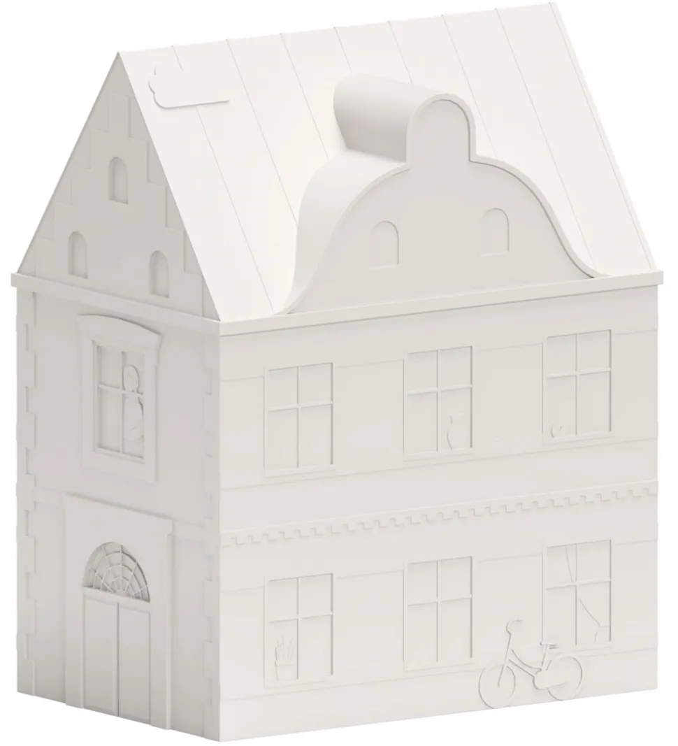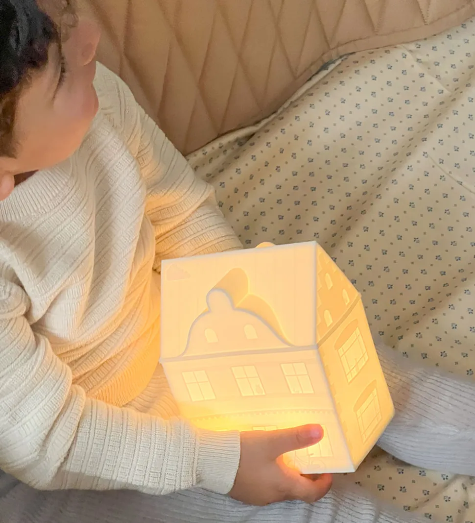 Hyggelig Cam Cam Copenhagen natlampe i hvid. Lampen er udformet som et charmerende københavnsk hus med fine detaljer og diskrete motiver i vinduerne.