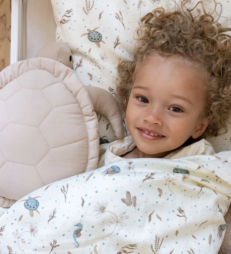 Sød Cam Cam Copenhagen pude i beige med form som en havskildpadde.