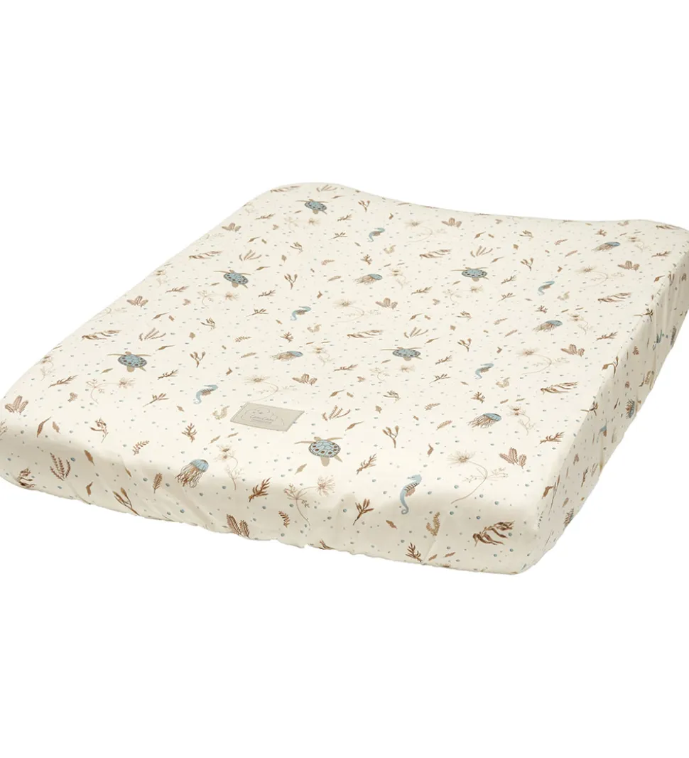 Flot Cam Cam Copenhagen puslepudebetræk i hvid med et smukt alloverprint af havdyr og -planter i brun og støvet blå.