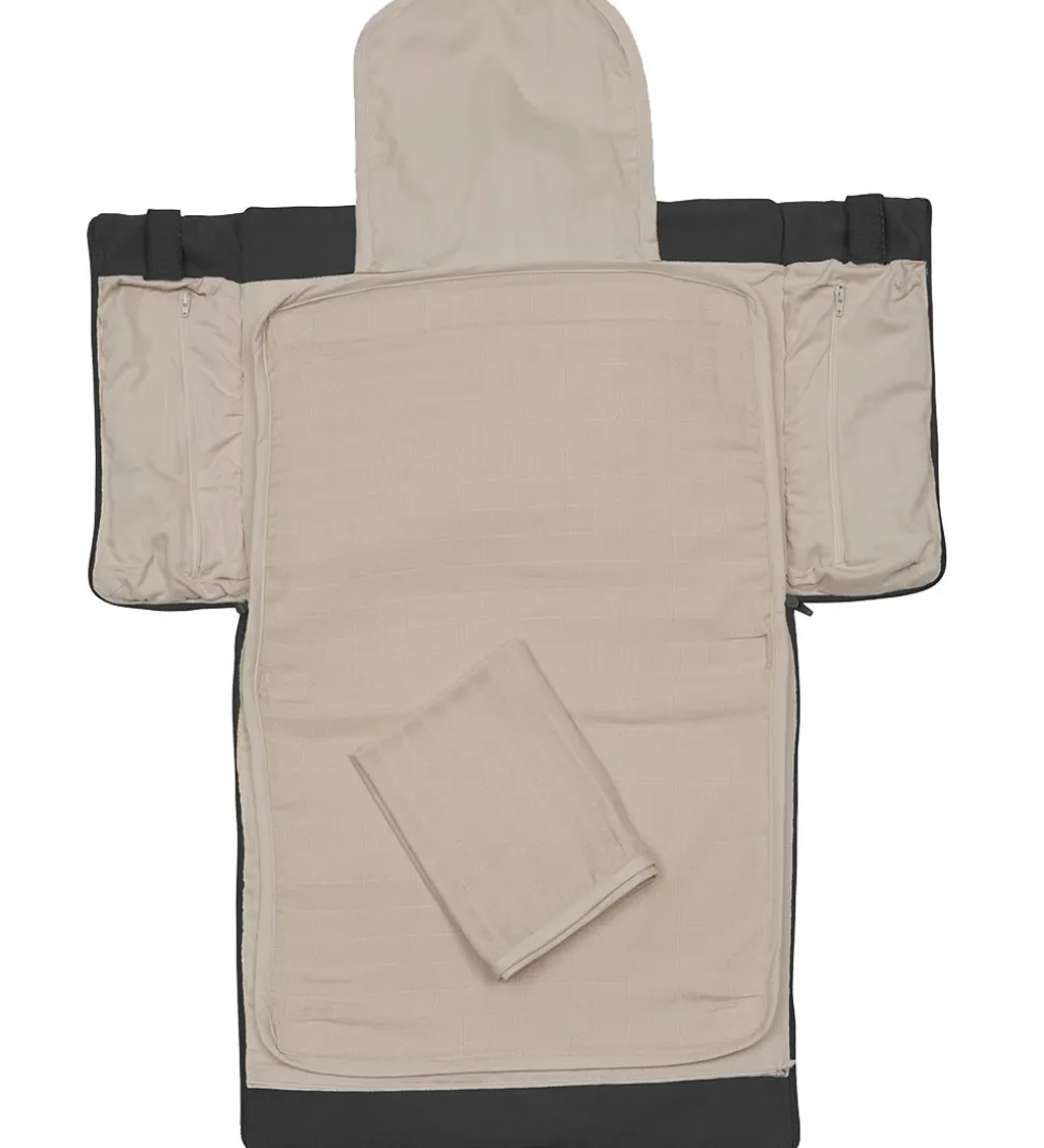Pusletasken er en fold-ud model, som kan lynes helt op i begge sider og bruges som skifteunderlag. Indvendigt er der en lomme med elastik i toppen og to mindre lynlåslommer i siderne. Der medfølger to stofbleer, som kan bruges som skifteunderlag, ved at sætte dem fast til tasken med velcro. Pusletasken har en god vattering og beige tekstil på indersiden.