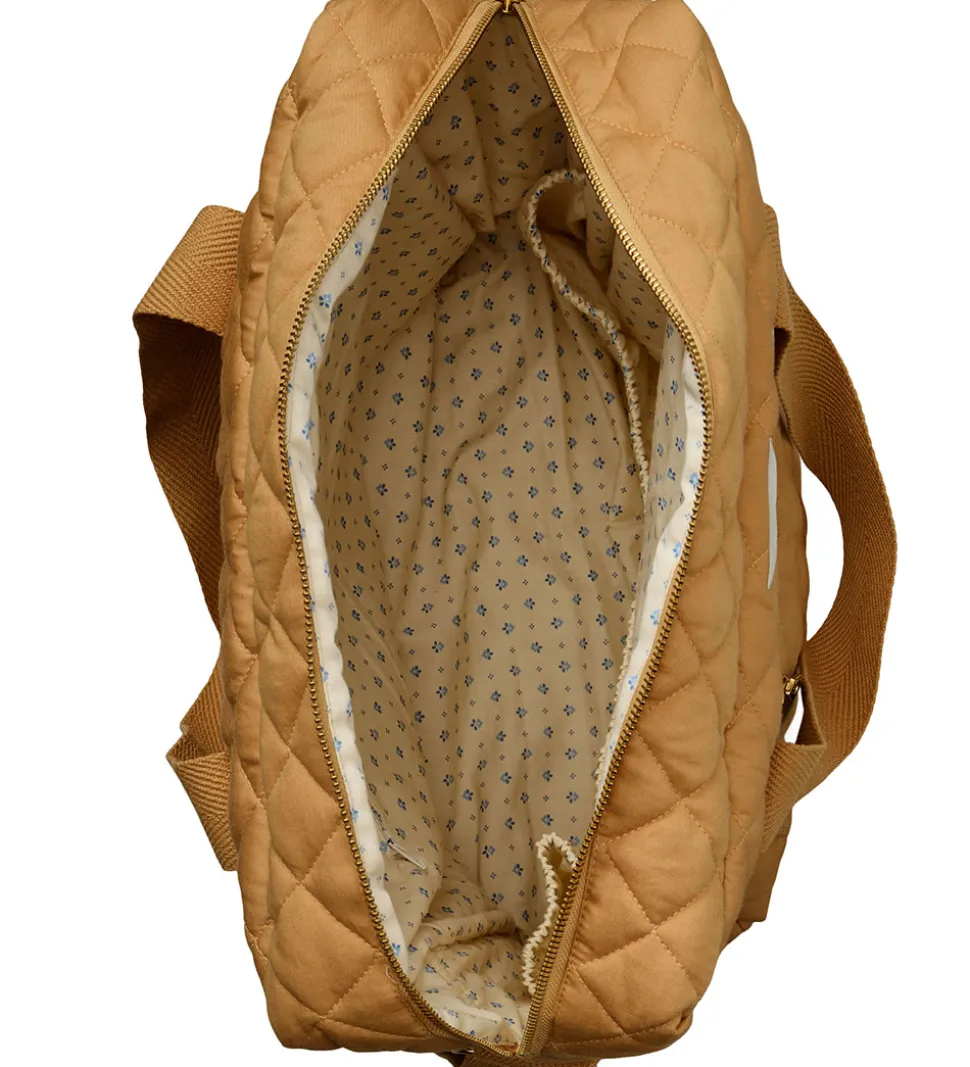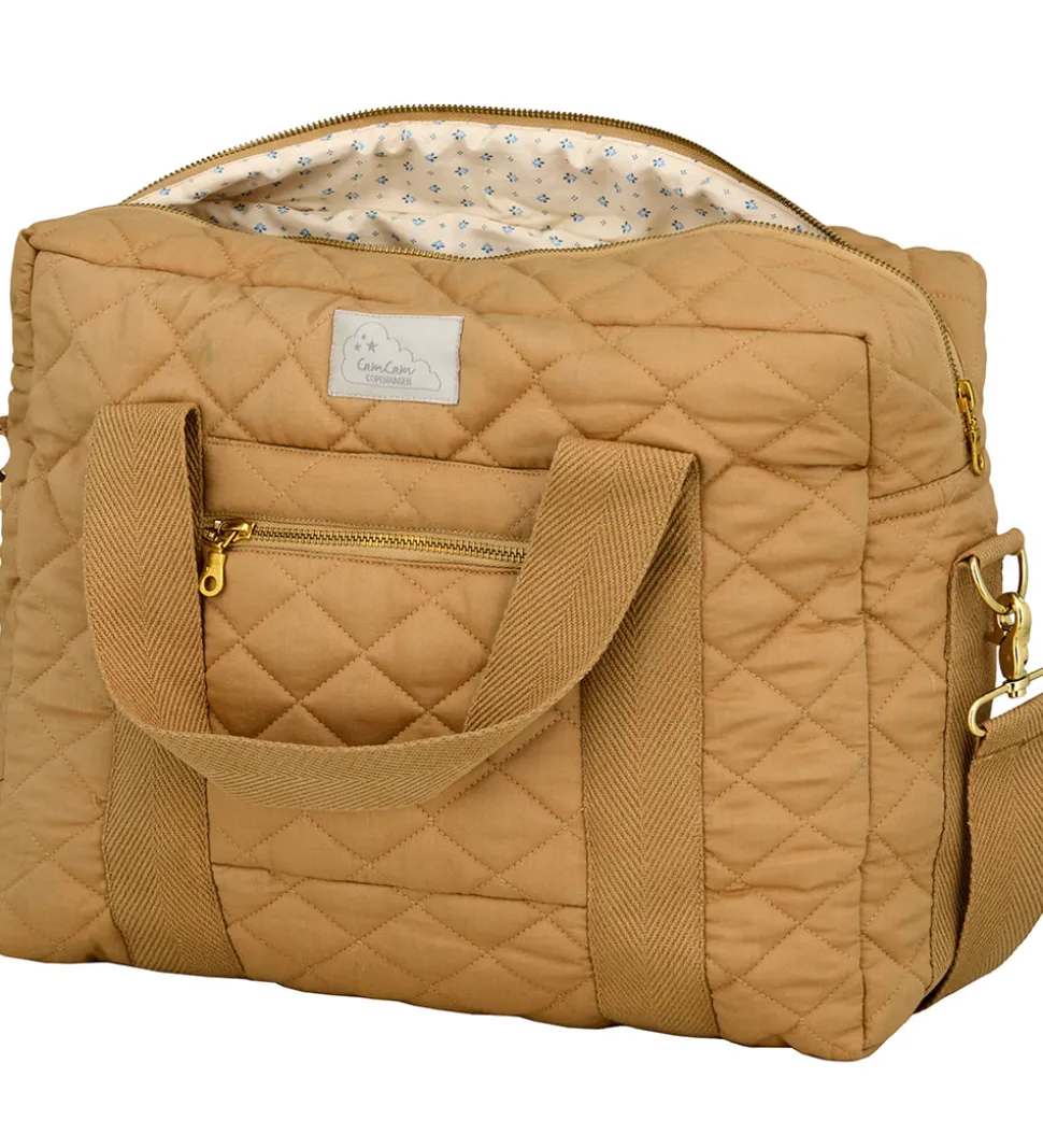 Flot Cam Cam Copenhagen pusletaske i honninggul. Pusletasken har en quilted struktur, og den har guldfarvede metalspænder og lynlås.