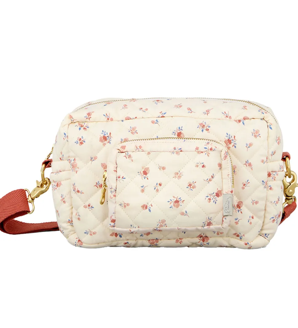 Flot Cam Cam Copenhagen pusletaske i hvid med et smukt alloverprint af bærplanter i rød og blå. Pusletasken har en quilted struktur, og den har røde remme og guldfarvede metalspænder og lynlås.