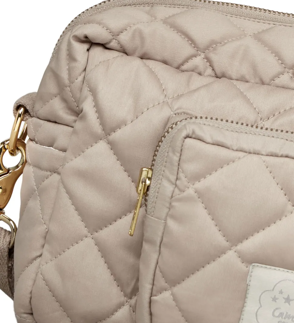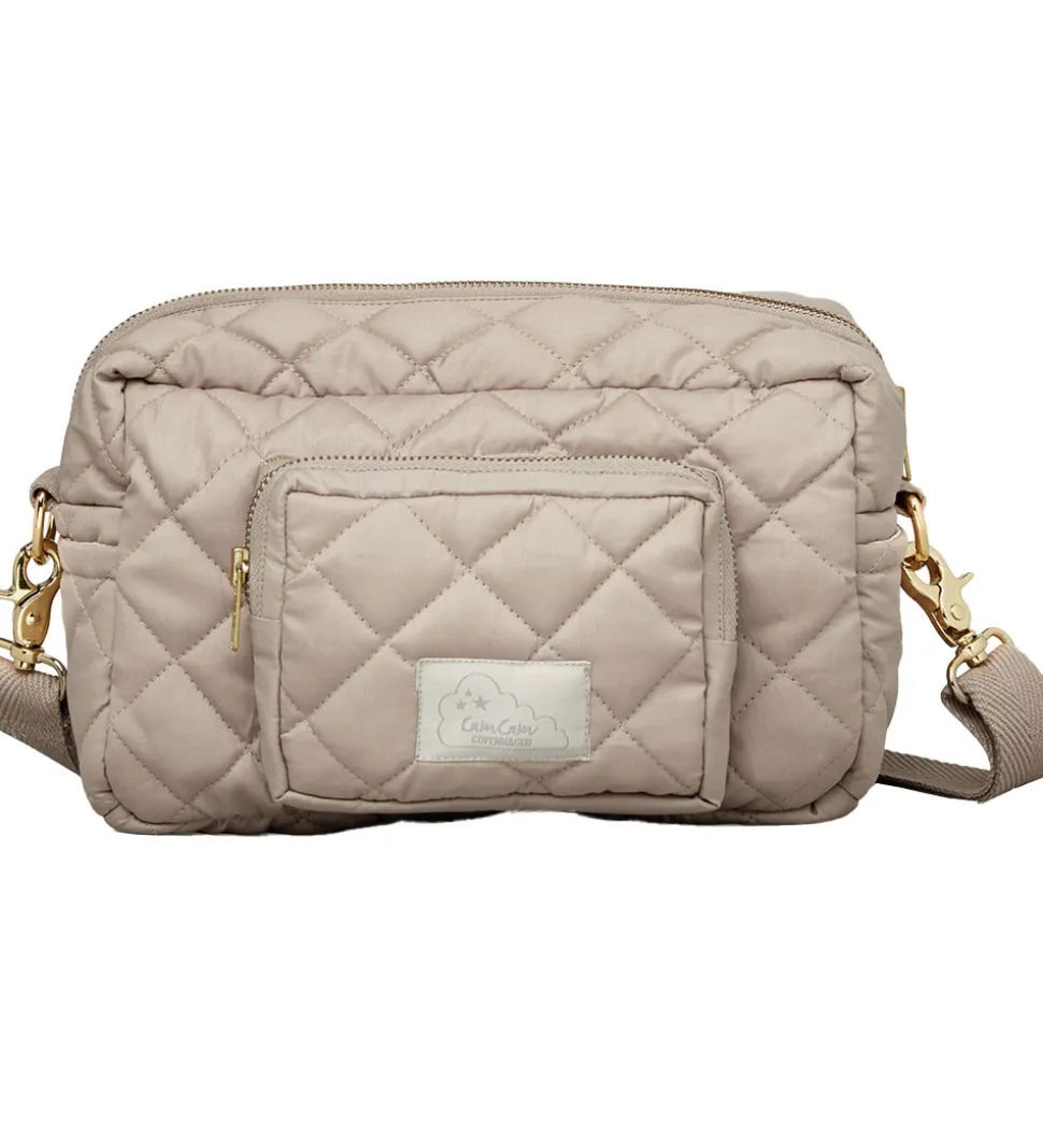 Lækker Cam Cam Copenhagen pusletaske i ensfarvet brun med en quilted struktur, og den har brune remme og guldfarvede metalspænder og lynlås.