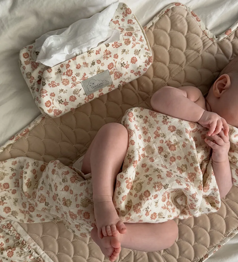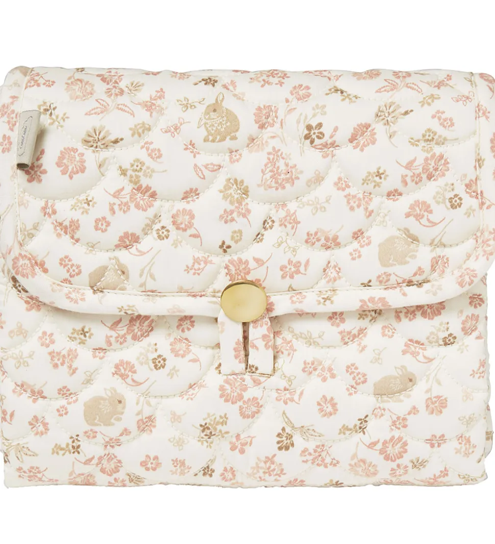 Pænt Cam Cam Copenhagen pusleunderlag, der på den ene side er i en cremehvid farve med et sødt blomster- og kaninprint i rosa og beige, og på den anden side er i ensartet beige. Den har også et flot, quiltet design.