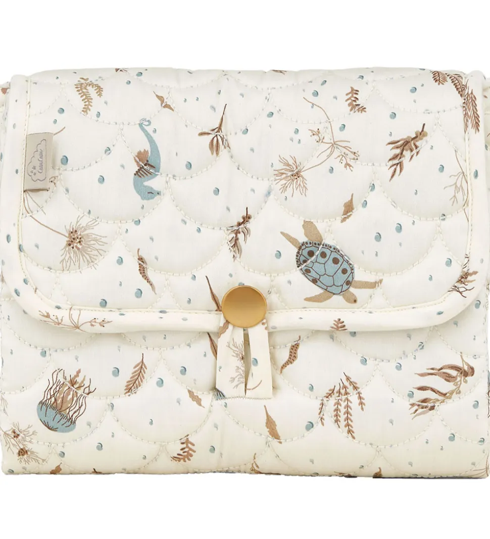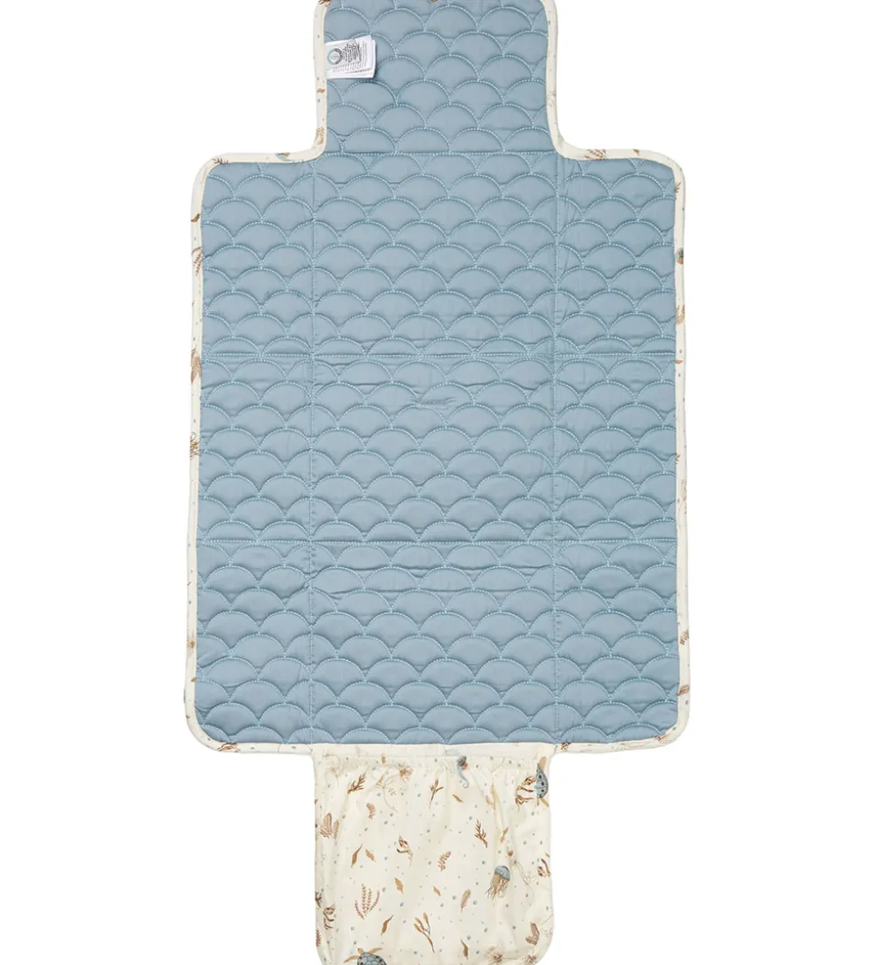 Flot Cam Cam Copenhagen pusleunderlag, der på den ene side er hvidt med et smukt alloverprint af havdyr og -planter i brun og støvet blå, og på den anden side er i ensartet, støvet blå. Den har også et flot quilted design.