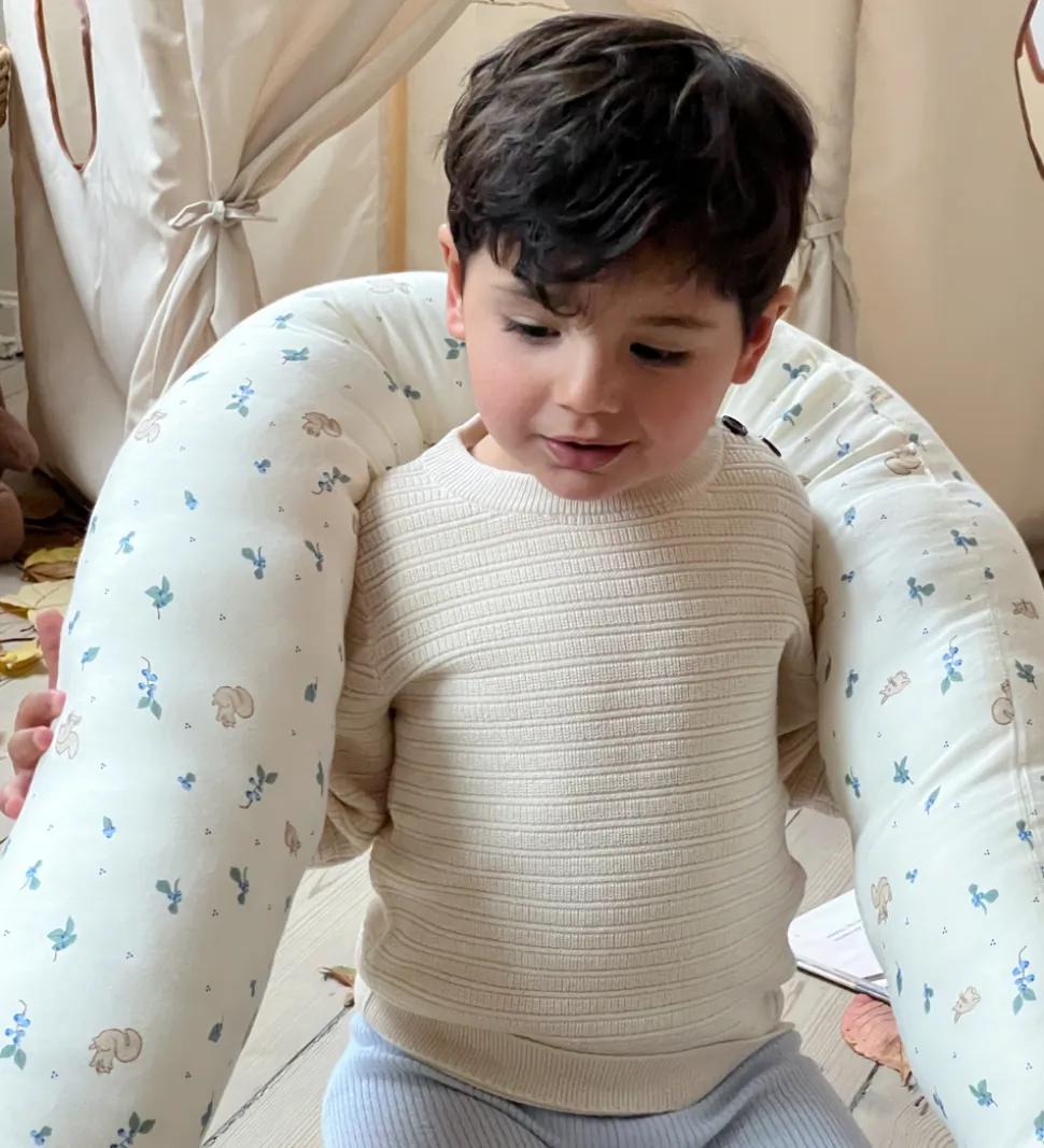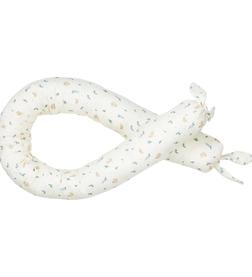 Fin Cam Cam sengerand i hvid med et charmerende print af egern, blåbær og blade. Sengeranden har en knude i begge ender, som gør det muligt at binde den fast til tremmesengen, eller binde enderne sammen. Sengeranden har form som en slange, og kan bruges som en blød kant langs sengerammen og som blødt krammedyr.